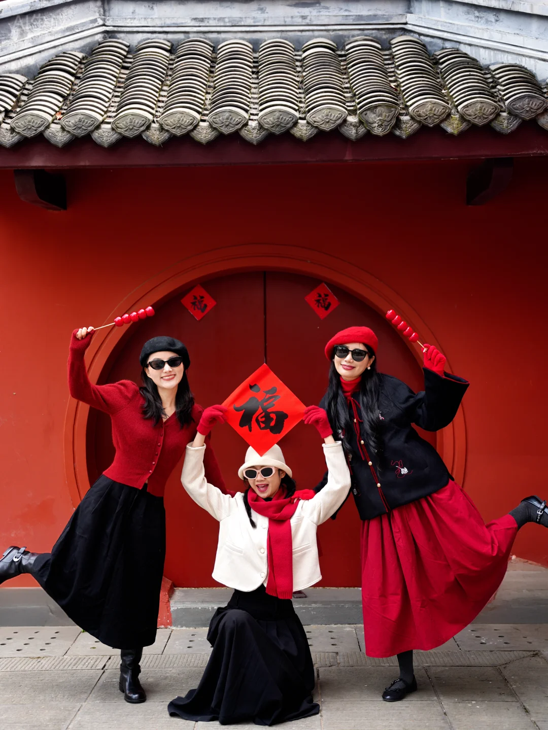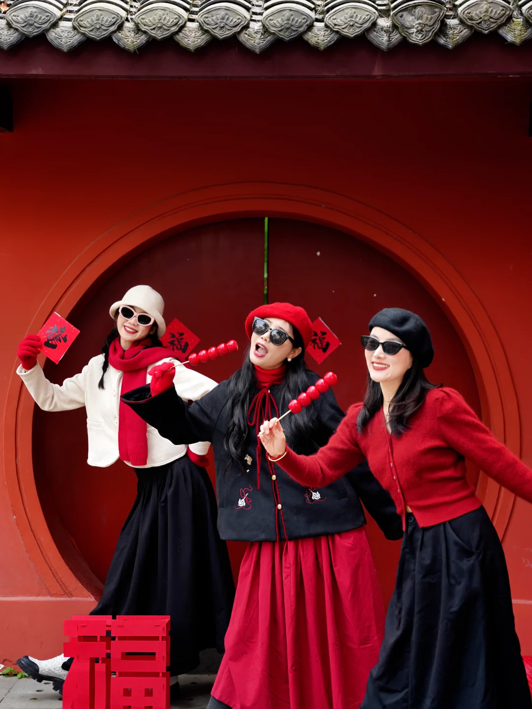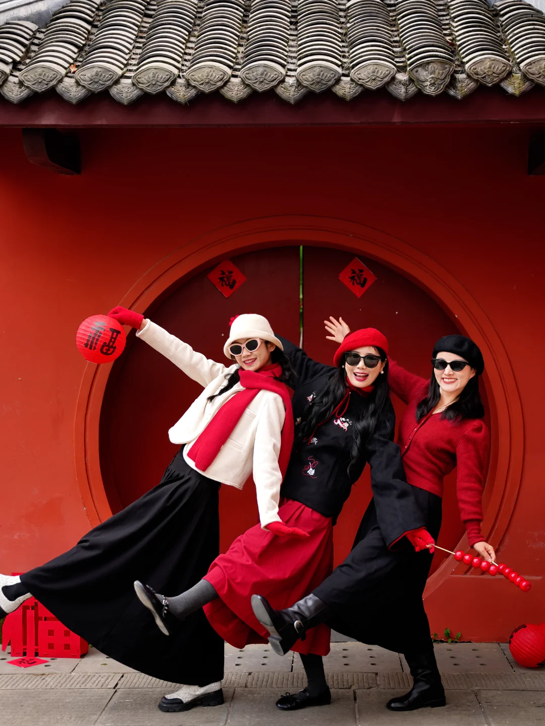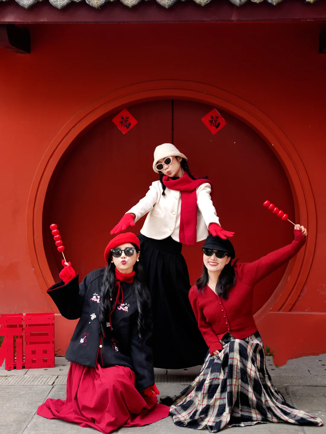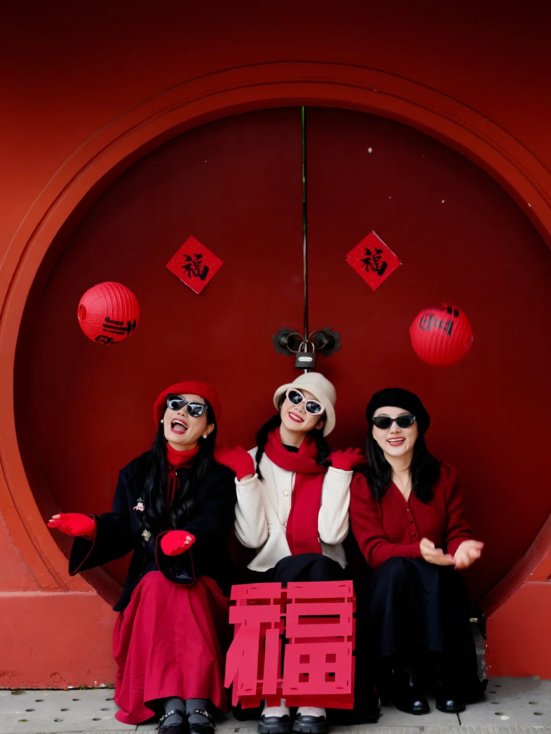 新年赶紧拉上好姐妹拍年味满满的过年照啦 快艾特好姐妹来拍!! · 👗穿搭小tips: 主色调就是红白、黑红色系,可以穿一样的服装或者是颜色相呼应的都可以。 白上衣➕红围巾➕黑裙子、红上衣➕黑裙子、黑上衣➕红裙子,在服装上就是互补色超有氛围感~ · 🧨道具: 红红火火的颜色都行,红包、糖葫芦、对联、福、帽子、围巾、手套…… · 然后找一面红墙就可以开始拍啦!!