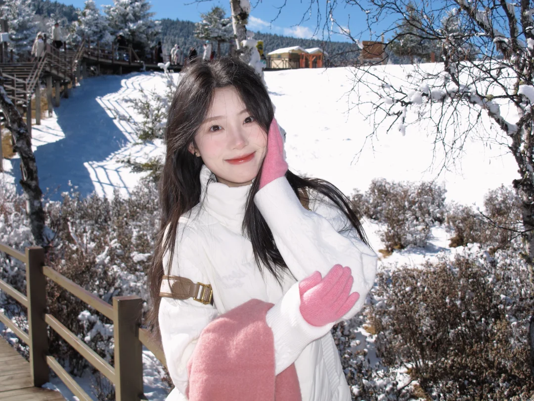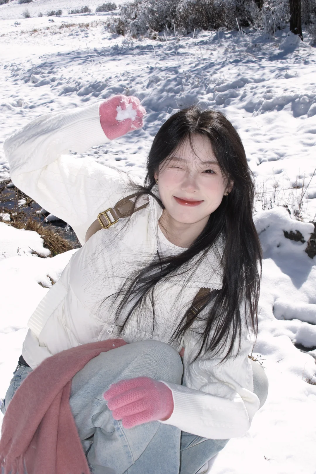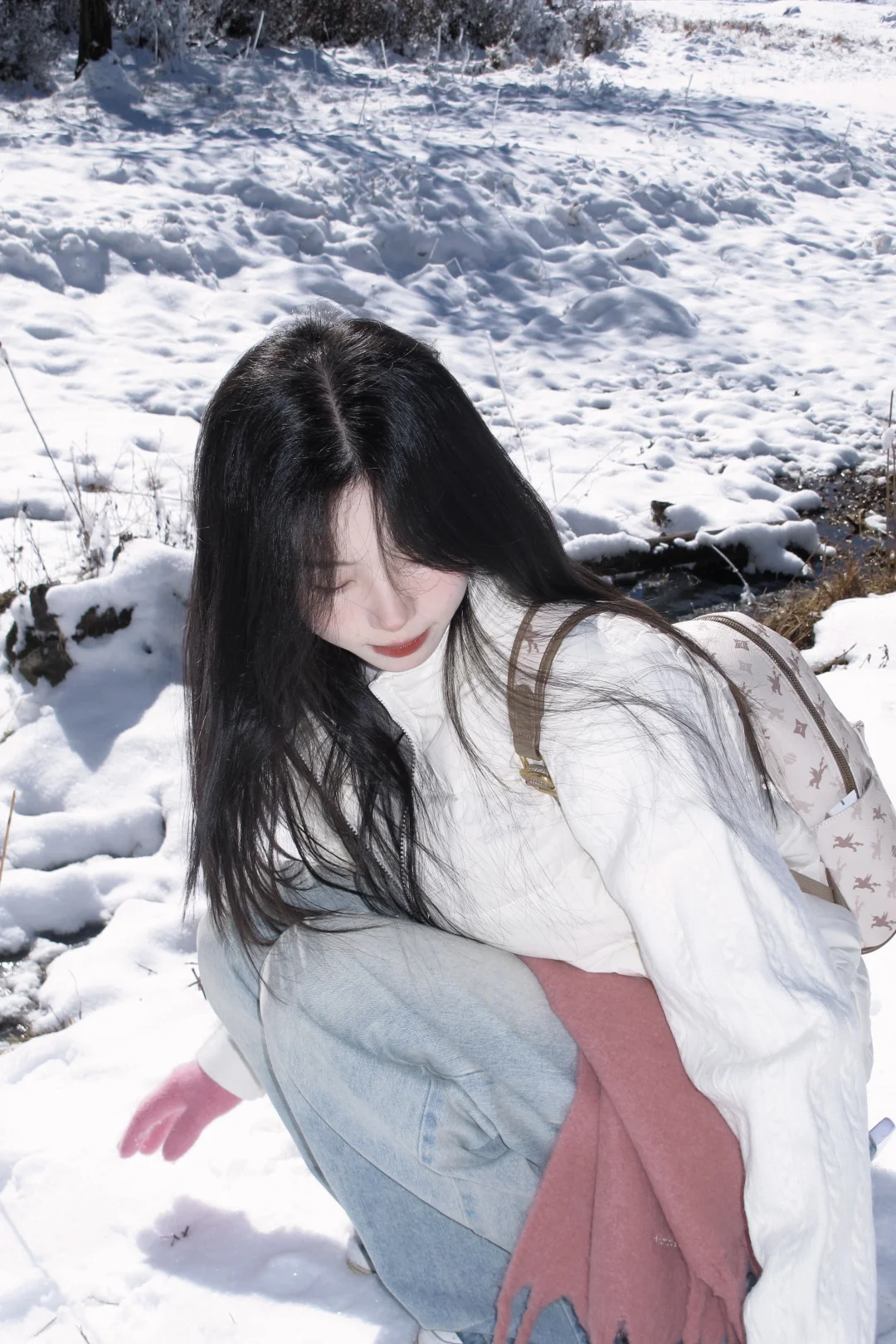 冬日雪景中的古典美人,红衣花影,韵味十足。