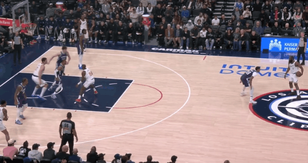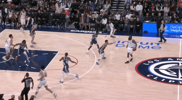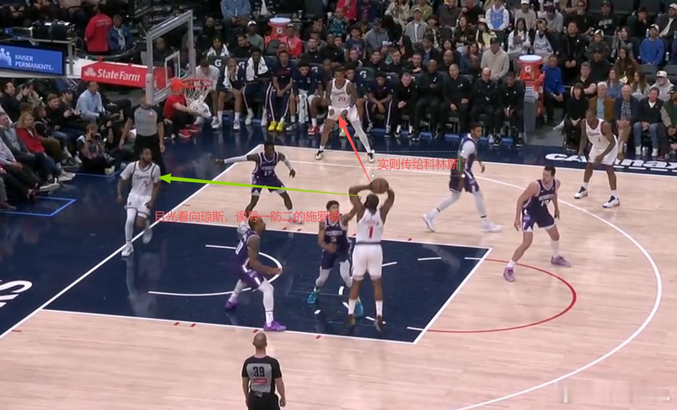 逐帧拆解:哈登技术细节解析,25年收官战助快船取得5连胜图1,LOGO位置持球佯装发动“Ram Screen”配合,实则抓穆雷“堵强势手侧”站左前方的针对性防守站位见招拆招:等大洛拉到上线后,立即启动右路突破一步过掉穆雷。利用广阔的中路空间长驱直入,面对篮下站住护框位置的威少直接使用欧洲步过掉,随后左手上篮打进。慢动作细节呈现:图2。图3边线球回合,琼斯“鹰式切入”(Hawk Cut)起手,设置完“背掩护”后顺势外弹接球行进至弱侧执行战术。这个回合施罗德选择“倒扣防守”(Top-Lock)阻止哈登上提执行战术,因此哈登随机应变更换了空手移动路线,科林斯也心领神会调整了掩护角度。哈登上提和柯南衔接手递手配合,接球下球调整后调整好脚步急停,坚决出手持球三分,顶着双人干扰命中。图4体前变向后见克里福德上提右脚,立即衔接胯下突左路攻击前侧脚(左路的空间也更开阔)。没能直接摆脱防守人,于是行进间主动寻求对抗撞开防守人,迅速衔接“反胯拉回”后上步二次发力对抗,撞开防守人迅速衔接前脚蹬地撤步中投。图5持球推过半场的同时指挥右侧伦纳德、大洛发动战术,误导防守后立即胯下启动右路突破,借助广阔的中路空间直杀篮下,过掉克里福德后如入无人之地,挑篮终结打停国王。慢动作细节呈现:图6。图7,“单打起手式”连续调度防守人重心+寻找进攻节奏后,使用体前+胯下衔接挖步启动左路突破。行进间阅读到德罗赞从底线前来夹击,立即使用背转身向中路行进,转身后佯装衔接换手撤步中投,实则跳起后“看琼传科”(图8)——后撤步起跳后连续两个假动作误导防守人,随后找到底角空位的科林斯。快船继续北伐哈登洛杉矶快船