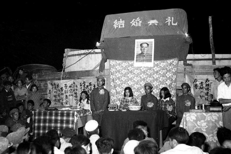 20世纪70年代,新疆生产建设兵团某个团场(农场)的集体结婚仪式现场。照片显示几对新人站在简易搭建的婚礼台上,台上悬挂毛泽东标准像,拱门大字标语“结婚典礼”,台下聚集大量兵团职工和群众围观,夜间灯光照明,氛围热烈而简朴。 兵团婚礼多采用集体形式,简约节俭、革命化,避免传统繁文缛节,强调“忆苦思甜”、忠诚毛主席。新人常在毛泽东像前宣誓或拜像,仪式包括领导讲话、互赠《毛选》或像章、共喝“幸福茶”,象征“革命夫妻”共同建设边疆。