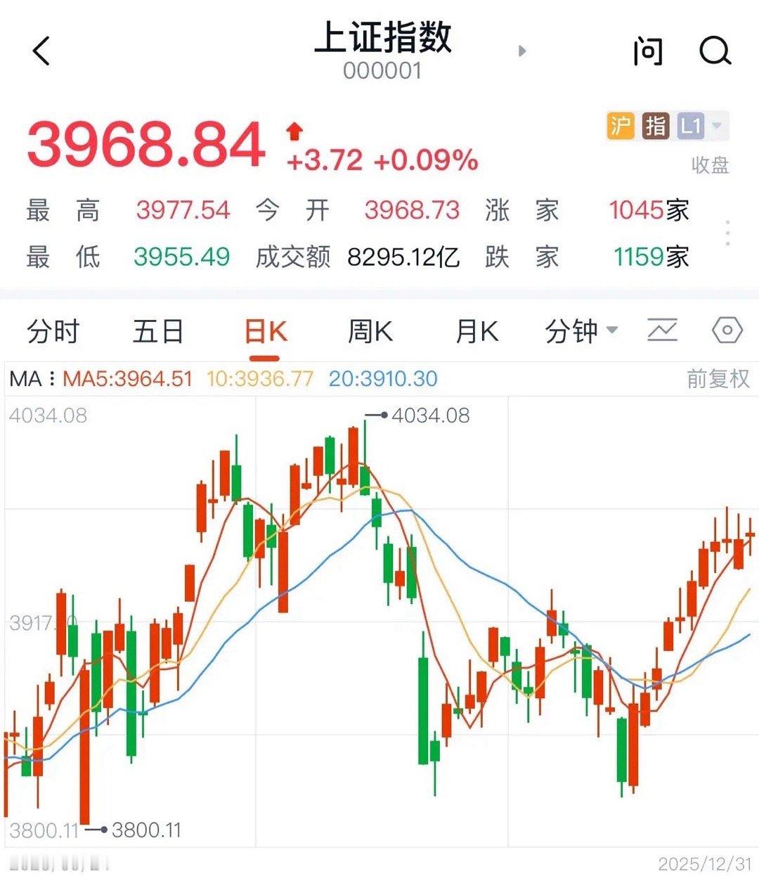A股十一连阳商业航天今天为何再次暴涨,2026年开门红可期4000点只是新起点:2025年12月31日收评,A股今天震荡收涨,平稳收官,布局了商业航天的散户今天吃继续吃大肉,多股涨停。今天再次放量两万亿元,说明市场不差钱,2026年开门红可期,估计4000点是2026年的新起点了,还是局部牛市。具体板块,盘面上看,机器人还是不行,市场还是我说的两大主线:商业航天和CPO,昨天CPO上涨,商业航天调整,今天CPO调整商业航天大涨,商业航天上涨逻辑很硬,前面我说了很多次:政策、逻辑、业绩三重催化。2026年还是布局这两大主线,长线看趋势,中线看波段,短线卡清晰,用尾盘交易法和半仓交易法即可。做主线不要做杂毛,在A股就十一连阳,一个月都爆赚。祝大家新年快乐,2026年局部牛市继续赚钱!