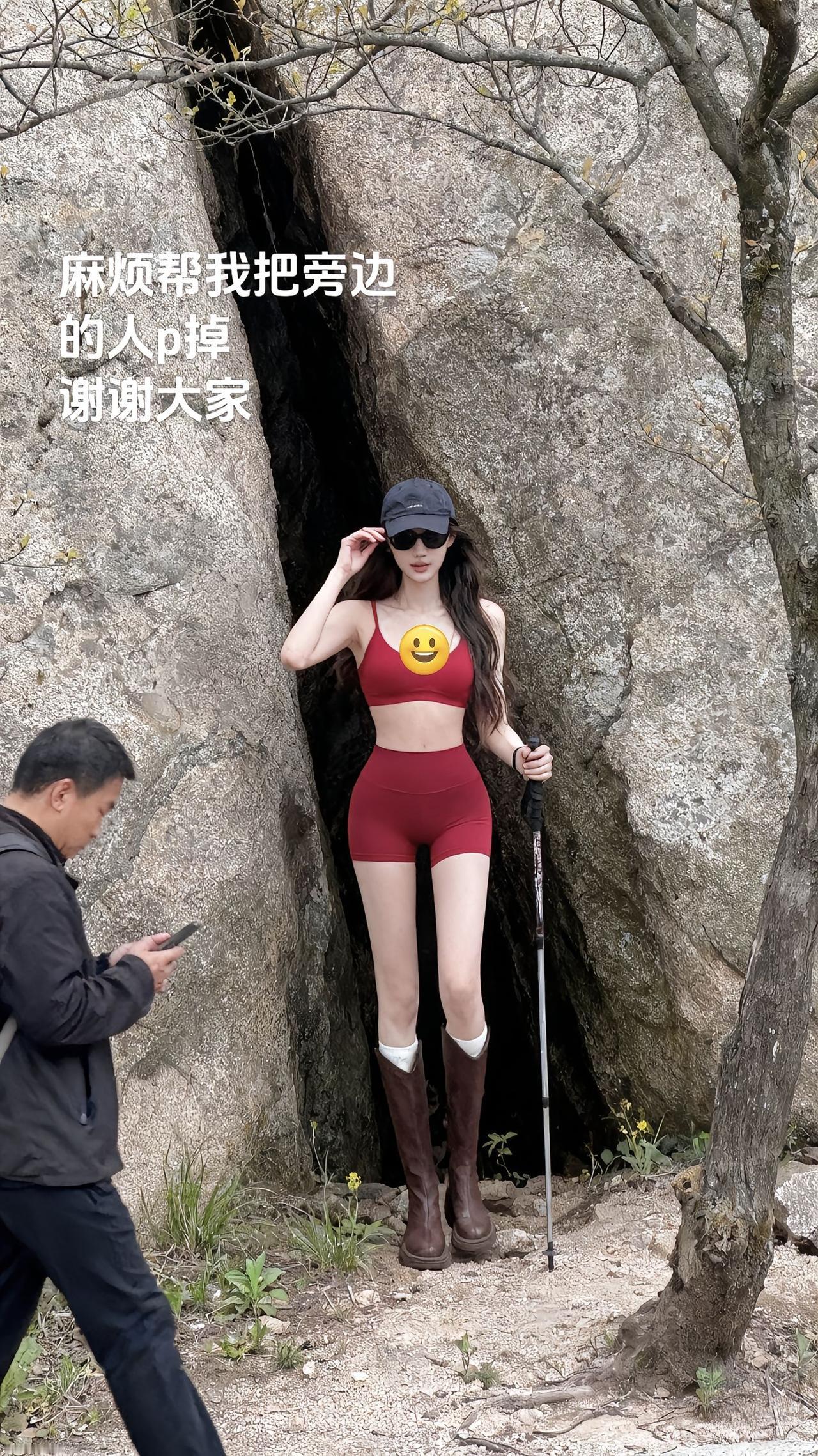 登山拍照被路人意外抢镜,只能在线求网友帮忙P掉了!穿红色健身服配长靴登山,本想拍酷飒大片,结果画风变得有点搞笑~你们拍照时遇到过哪些抢镜名场面? 求P图 登山搞笑瞬间 穿搭反差爬山拍照