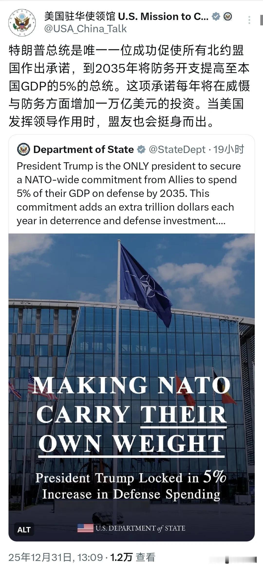 美国驻华使领馆今天(12月31日)发文写道:“特朗普总统是唯一一位成功促使所有北约盟国作出承诺,到2035年将防务开支提高至本国GDP的5%的总统。这项承诺每年将在威慑与防务方面增加一万亿美元的投资。当美国发挥领导作用时,盟友也会挺身而出。” 评几句: 特朗普的北约军费“政绩”?不过是霸权捆绑与口头空文 美国驻华使领馆高调吹捧特朗普促成北约盟国承诺2035年防务开支达GDP5%,这话听着光鲜,实则经不起推敲。 先看这目标有多不切实际:据北约官网数据,2024年北约成员国整体军费占比仅2.71%,排除美国后欧洲盟国更是仅1.6%,多数国家连2%的旧标准都难达标 。西班牙明确拒绝突破2.1%的现有水平,比利时仅能承诺2034年升至2.5%,斯洛伐克则直言有更优先事项无需增军费 。对经济低迷、财政吃紧的欧洲国家而言,5%的目标近乎天方夜谭,所谓承诺更像是应付特朗普的权宜之计。 更关键的是美国的深层算计:自身国债总额已达38.4万亿美元,年利息支出高达1.2万亿美元,无力再为盟友“补贴”防务 ,便转头逼迫欧洲买单。这背后既是让盟友为其霸权战略输血,更是为美国军工复合体捆绑大额军购订单,把北约变成收割盟友利益的工具。所谓“盟友挺身而出”,不过是特朗普的施压话术——不涨军费就威胁加征关税、踢出北约 。 这场看似光鲜的“政绩”,本质是跨大西洋关系的裂痕。口头承诺终会败给经济现实,霸权捆绑换不来真正的同盟,北约内部的深层分歧,早已说明一切。