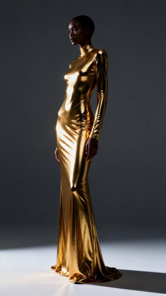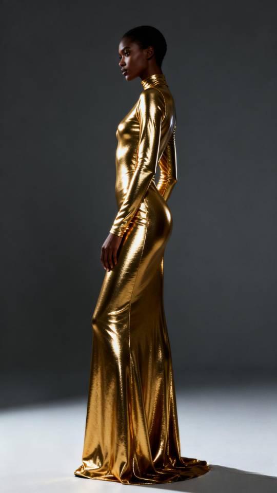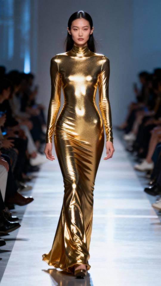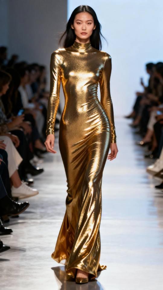 模特展示金色连衣长裙。连衣长裙 连衣裙 晚礼服 金色礼服
