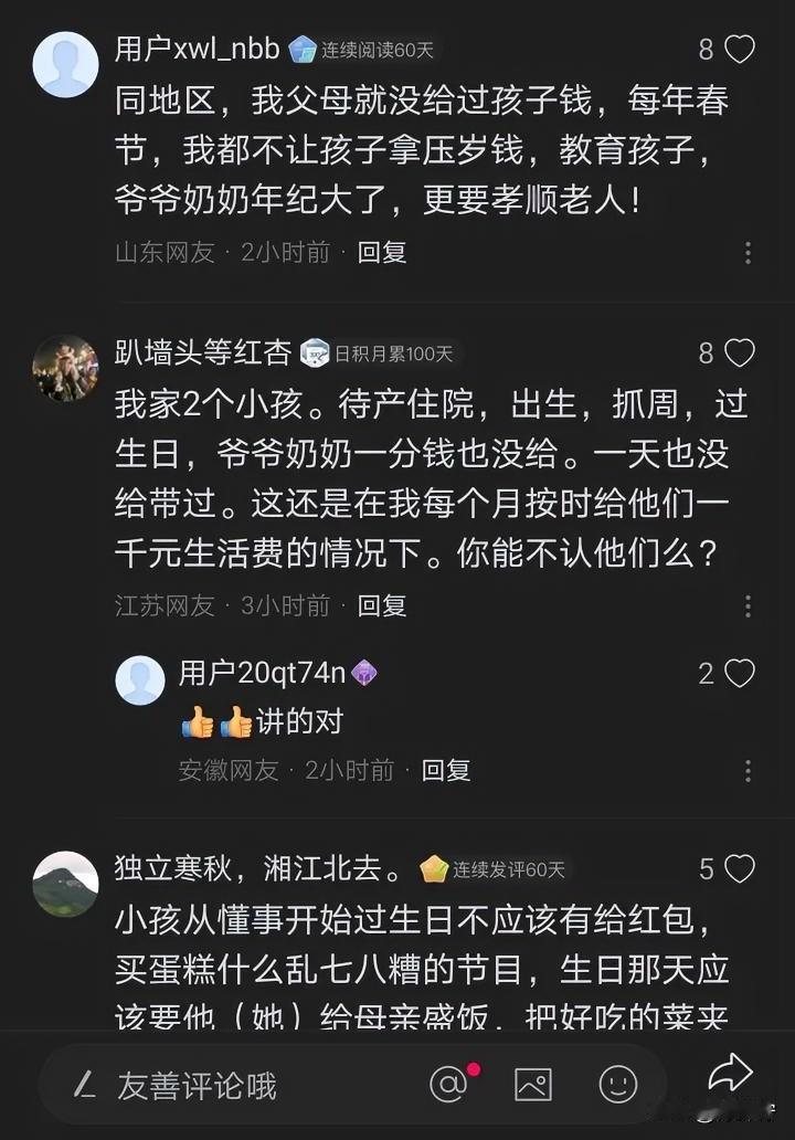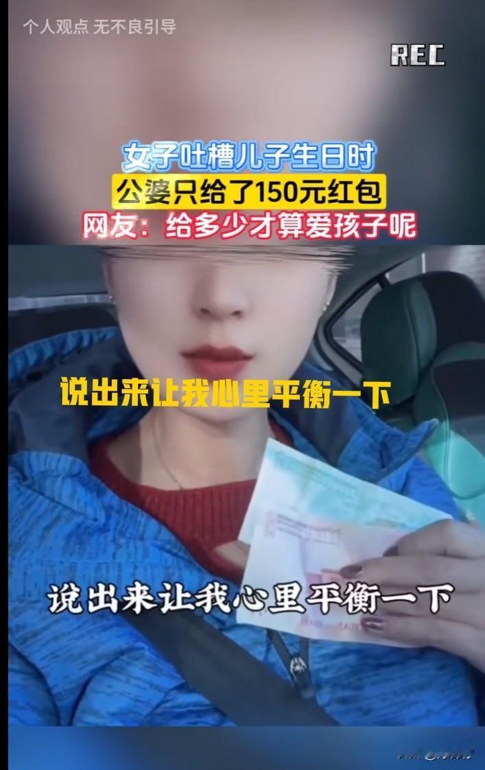 公婆要给多少钱才算是爱呢?一年轻女子拍视频,在网上吐槽公公婆婆,她想问问大家,谁家孩子过生日,爷爷奶奶就只给150块钱,还让大家出来说说,好让她心里平衡一下。 说实话有的给就已经不错了,竟还嫌弃上了,给多少都是他们的心意,人心不足蛇吞象! 更有网友评论:和女子是同地区,父母就没给过孩子钱,每年春节,都不让孩子拿压岁钱,教育孩子,爷爷奶奶年纪大了,更要孝顺老人! 婆家主动给