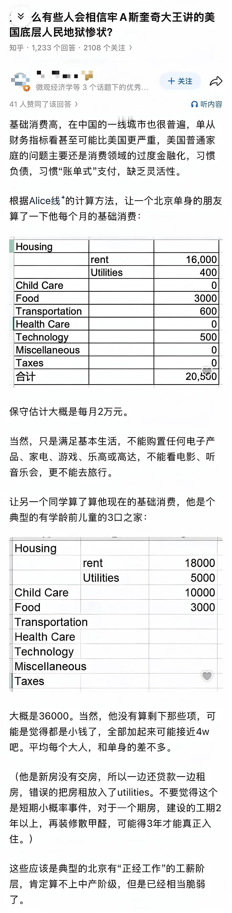 当爆美国斩杀线之后,总有人拼命要洗,也总有人为了反国内而硬反。 一张表格,两个虚构的角色,几组不靠谱的数据,剩下的全靠想象和编,然后就开始抹黑一线城市的生存线了。 北京单身16000房租,吃却只花3000,然后说没有乐高或高达,这一切是咋编出来的?都快被斩杀了,还租16000的房子,还把乐高和高达列入精神必需品? 而另一个例子一家三口,同样是北京,花在吃的也是3000,这得多连数据都懒得修改了? 其实众所周知,国内也卷,也有压力。但是国内只要你勤快点,基本不需要你资不抵债地去破产,去流浪,更不会有3-6年的生存期。而低保户政策更是落实到位!这才是中美最大的区别。 大家讨论下,这波为斩杀线洗地的是谁呢?