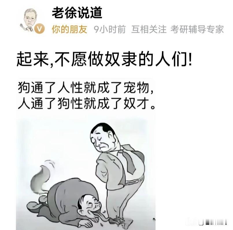 看图说话:狗通了人性,就成了宠物!人通了狗性,就成了奴才!但狗是低级动物,人是高级动物,怎能等同? 京城老徐:起来,不愿做奴隶的人们! 老徐的幽默呼喊,令人想到“国际歌”:世界上没有救世主,也没有神仙皇帝!要创造人类的幸福,全靠我们自己! 在文明法治社会里,人民是国家主人!无论官员与百姓,教授与农民,都是国家公民,一律平等!哪有什么高低贵贱之分?哪有什么“主子”“奴才”呢? …………