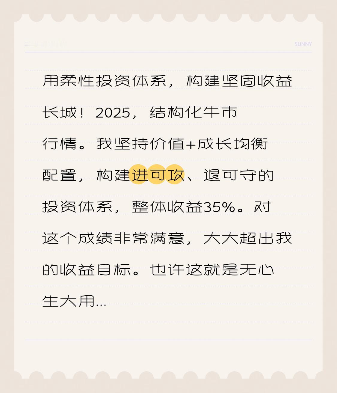 用柔性投资体系,构建坚固收益长城! 2025,结构化牛市行情。我坚持价值+成长均衡配置,构建进可攻、退可守的投资体系,整体收益35%。 对这个成绩非常满意,大大超出我的收益目标。也许这就是无心生大用吧。 2026,行情将更加波澜壮阔。对,我用这个词来形容。经济在稳步前行,科技进步步伐将迈得更大,消费复苏坚定而韧性。 新的一年,不管怎么波动,我都将坚守交易体系,同时动态调整,期待与大家共赢。 收获满满的2025,信心满满的2026! 如何玩转产业链投资 股市点滴交流 普通人炒股能炒出财富自由吗?
