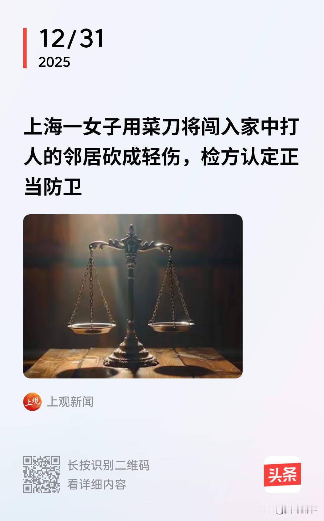 “他都欺负到家里来了,难道我不能反击?”上海松江,女子打扫卫生时,水不小心滴到了楼下邻居家中,邻居为此上楼闯进女子家中,对其实施殴打,女子随即抓起菜刀将对方砍致轻伤二级。而后,女子被处10日拘留,还要因故意伤害罪被追究刑责?结局亮了! 徐女士和康某是住在同一楼栋的邻居家,徐女士住在二楼,康某住在一楼。 多年来,两家因日常琐事,矛盾不断,已经积怨很深。 事发当天,徐女士在家大扫除时,因冲洗窗台灰尘的水流到了康某家,康某瞬间勃然大怒,且借题发挥,质问徐女士为什么要这样做。 徐女士则顺嘴回了一句:“水往低处流,当下雨就好”,这句话彻底点燃康某。 康某随即冲上二楼,一脚踹开徐女士家的老式防盗门,径直冲进客厅,将徐女士按在沙发上挥拳殴打。 此时,徐女士的丈夫正在厨房切菜,见此情景,他赶忙上前想拉开康某。 但由于康某力气大,徐某的的丈夫被推开一旁并遭到踢踹。 眼看康某又要扑向自己,徐女士慌乱中随手抓起茶几上的东西朝对方挥去,只见对方鲜血满面。 缓过神后,徐女士才发现手里攥着的是丈夫顺手放着的菜刀。 事后,康某经验伤认定构成轻伤二级。 徐女士本人则受轻微伤。 徐女士因涉嫌伤人,先是被警方处以10日拘留处罚。而后,又被警方以故意伤害罪移交检察院审查起诉。 对此,徐女士彻底懵了,在她看来,明明是康某闯入家中殴打自己,自己只在这种情况下的紧急自保反应,怎么反而要被抓呢? 其实,本案的争议主要在于,康某闯入徐女士家中进行施暴时,徐女士拿菜刀反击致对方轻伤的行为,到底算不算防卫过当? 根据《刑法》规定,为保护人身安全免受正在进行的不法侵害,采取制止行为造成侵害人损害的,属于正当防卫,不负刑事责任。 从徐女士的防卫起因和目的上看,康某无故踹门入户施暴,其人身危险性可想而知。 徐女士在紧急时刻,予以反击,完全属于人之常情。 在防卫时间上,康某对徐女士进行侵害时,虽徐女士的丈夫拉开康某,但康某仍继续踢踹并存在攻击行为,证明此时,不法侵害并未结束,徐某某仍面临现实危险,其可以进行反击。 最关键的防卫限度:《刑法》认定防卫过当,必须同时满足“明显超过必要限度”和“造成重大损害”,二者缺一不可。“ 本案中,徐女士的反击行为只是为了制止施暴,没有“赶尽杀绝”,最终造成康某轻伤二级的结果,完全没有超出必要范围。 综上,徐女士成立正当防卫,无须承担刑事责任。 最终,检方经对案件重新取证,认定徐女士的行为符合正当防卫标准,依法作出了不批准逮捕的决定。 总的来说,“家”应是保护我们自身安全的最坚实的“堡垒”。 但凡有人敢无视边界,踹门入户、肆意施暴,法律当会偏向守家护院的一方,为防卫人硬气地撑腰。 本案的结果不正是这一真实的写照吗? 对此,你怎么看呢?欢迎大家在评论区留言。