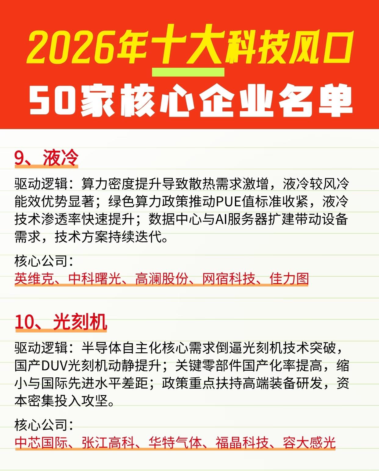 2026年十大科技风口及核心企业如下: 1. 人形机器人:核心零部件技术突破+特斯拉Optimus量产+AI算法赋能+政策支持,核心公司:绿的谐波、汇川技术等。 2. AI算力:大模型算力需求指数增长+英伟达H200与国产GPU互补+“东数西算”推进,核心公司:寒武纪、中际旭创等。 3. 商业航天:低轨卫星互联网提速+火箭回收/卫星量产降本+全链条订单爆发,核心公司:中国卫星、中国卫通等。 4. 智能驾驶:L3级自动驾驶商用试点+核心部件成本下降+车路云一体化,核心公司:长安汽车、禾赛科技等。 5. 可控核聚变:能源转型需求+“人造太阳”技术突破+配套技术成熟+政策资本支持,核心公司:海陆重工、雪人集团等。 6. 存储芯片:AI/消费电子升级拉动需求+HBM高端缺口+国产替代突破,核心公司:江波龙、德明利等。 7. 半导体:同可控核聚变驱动逻辑(注:原文重复),核心公司:海陆重工、雪人集团等。 8. 6G:星地融合/超维度天线突破+5G-A铺垫+适配新场景+各国研发,核心公司:信科移动、中兴通讯等。 9. 液冷:算力密度提升散热需求+液冷能效优势+绿色算力政策推动,核心公司:英维克、中科曙光等。 10. 光刻机:半导体自主化需求+国产DUV提升+零部件国产化+政策扶持,核心公司:中芯国际、张江高科等。