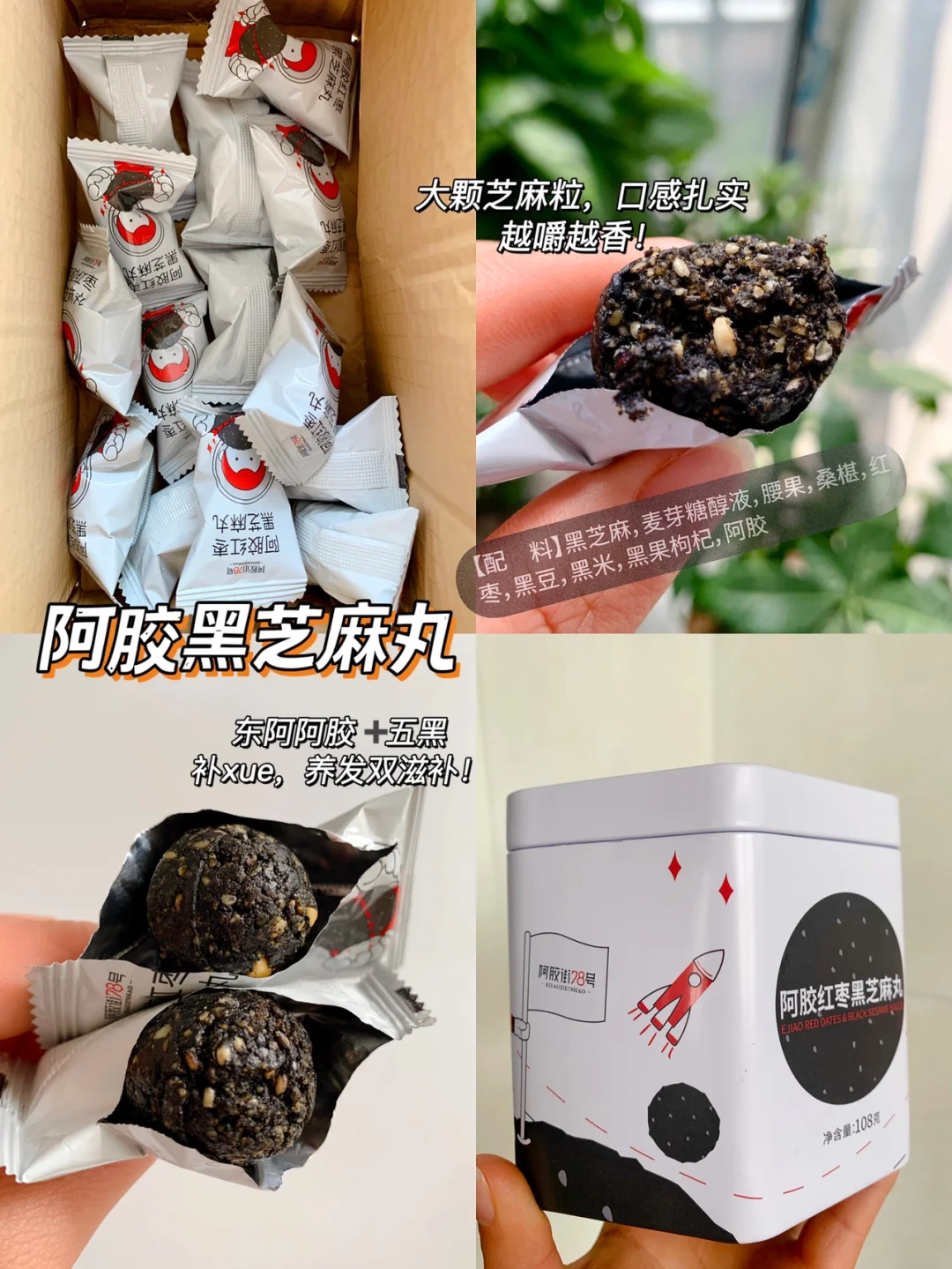 大颗黑芝麻颗粒,芝麻香味浓,越嚼越香,不油腻!阿胶➕五黑又添了红枣,腰果,口感丰富的同时补xue,养发双z补,无蔗糖!每天一粒以黑养黑,长毛毛呀~
