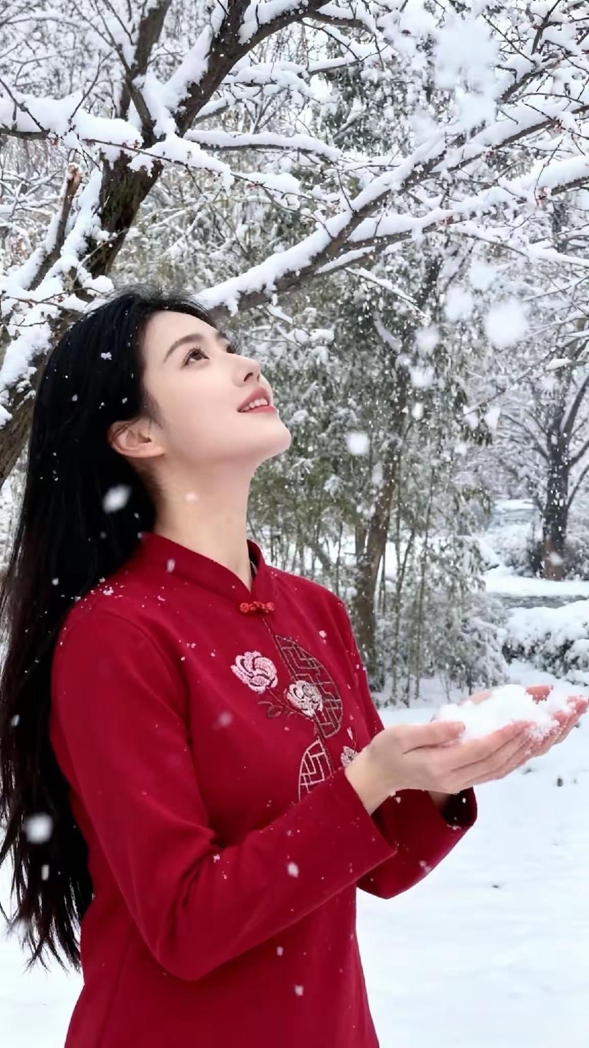 冬日暖阳下,红衣少女与飘雪共舞,岁月静好。