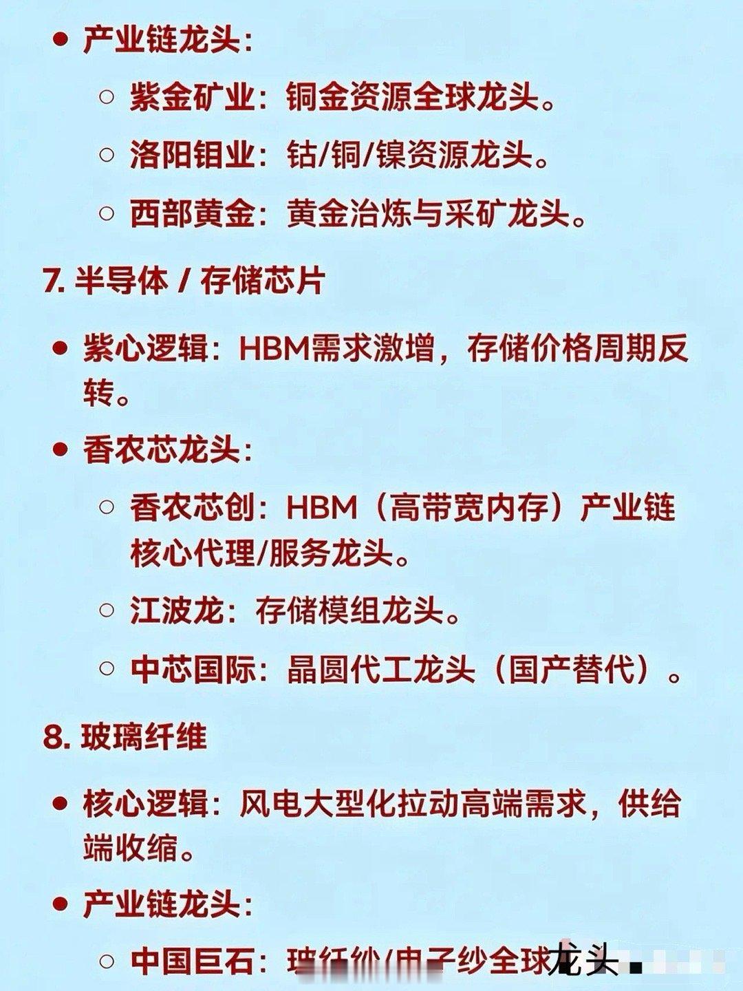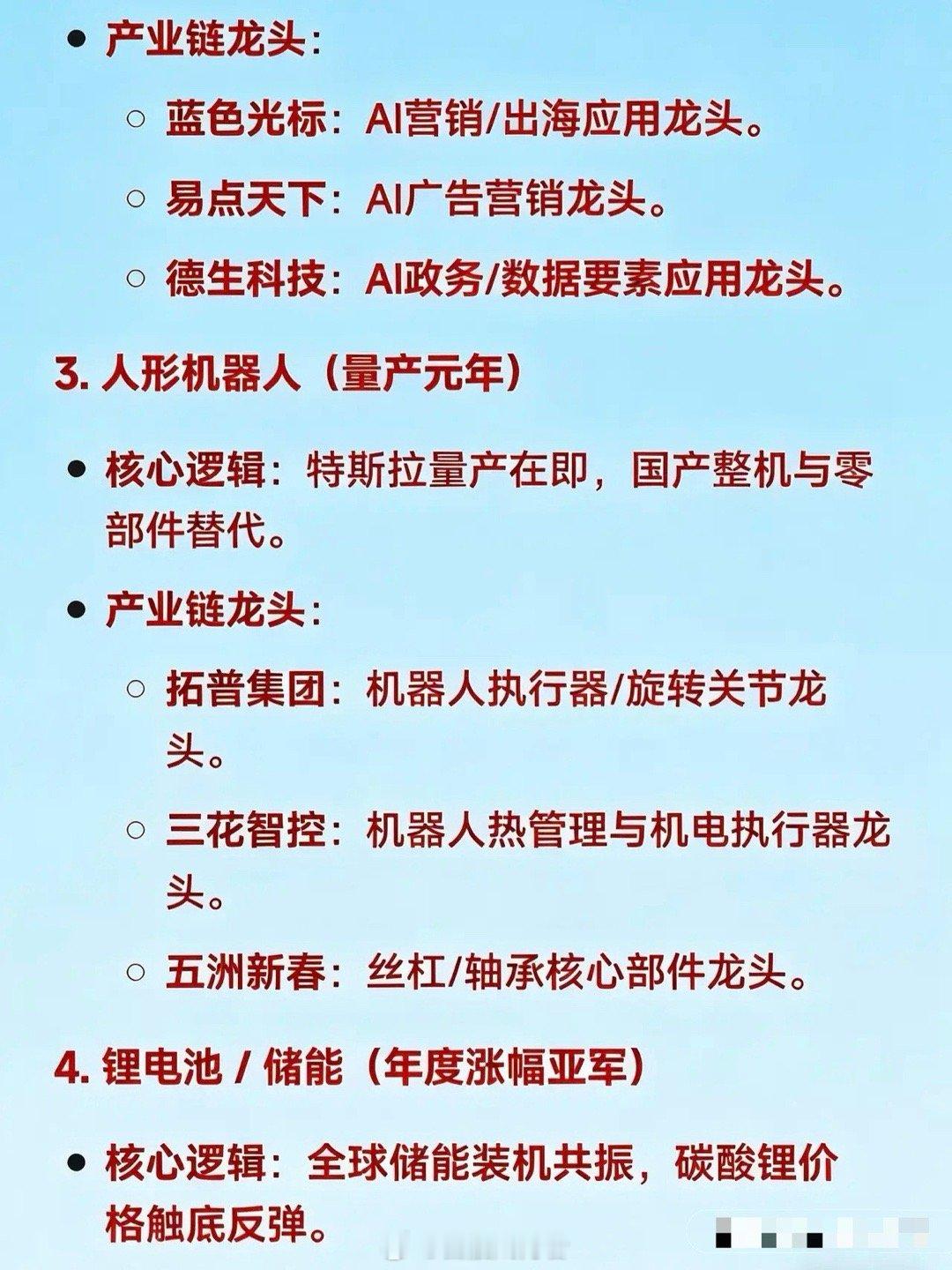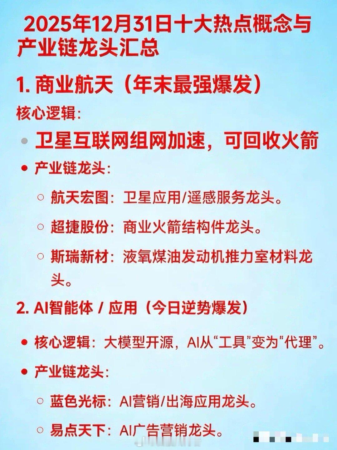 2025年12月31日十大热点概念及产业链龙头盘点,快来看看有没有你关注的领域:1. 商业航天(年末强势爆发)核心逻辑:卫星互联网组网进程加速,可回收火箭技术实现关键突破,行业迎来规模化发展契机。产业链龙头:• 航天宏图:卫星应用与遥感服务领域龙头,技术覆盖广、场景落地深。• 超捷股份:商业火箭结构件核心供应商,产品性能适配多型号火箭需求。• 斯瑞新材:液氧煤油发动机推力室材料龙头,为火箭动力系统提供关键支撑。2. AI智能体/应用(今日逆势走强)核心逻辑:大模型开源化推进,AI从工具属性向“智能代理”升级,应用场景加速落地。产业链龙头:• 蓝色光标:AI营销领军者,布局出海应用场景,技术与业务融合度高。• 易点天下:AI广告营销龙头,算法驱动精准投放,全球化服务能力突出。• 德生科技:AI政务与数据要素应用标杆,深耕民生服务场景数字化。3. 人形机器人(量产元年启动)核心逻辑:特斯拉量产计划临近,国产整机及核心零部件替代进程提速。产业链龙头:• 拓普集团:机器人执行器与旋转关节龙头,技术适配人形机器人运动需求。• 三花智控:聚焦机器人热管理与机电执行器,核心部件性能领先。• 五洲新春:丝杠、轴承等核心部件龙头,为机器人精密运动提供支撑。4. 锂电池/储能(年度涨幅亚军)核心逻辑:全球储能装机量共振增长,碳酸锂价格触底反弹,行业景气度回升。产业链龙头:• 宁德时代:动力电池与储能电池全球龙头,技术与产能规模双领先。• 阳光电源:储能逆变器及系统集成龙头,全球化布局优势显著。• 天际股份:六氟磷酸锂(电解液核心材料)龙头,受益于电解液需求回暖。5. 光模块/CPO(年度涨幅冠军)核心逻辑:AI算力需求爆发,全球800G/1.6T光模块升级潮来临,行业量价齐升。产业链龙头:• 中际旭创:光模块全球龙头,高速产品出货量领先。• 新易盛:高速光模块核心供应商,深度参与全球算力网络建设。• 天孚通信:光器件/组件龙头,产品覆盖全产业链关键环节。• 仕佳光子:PLC光分路器芯片龙头,技术壁垒高。6. 稀贵金属(资源牛市延续)核心逻辑:全球降息周期开启,美元走弱推动贵金属避险需求上升,叠加工业用金需求增长。产业链龙头:• 紫金矿业:铜、金资源储备与产能全球领先,多元化布局抗风险能力强。• 洛阳钼业:钴、铜、镍等关键金属龙头,受益于新能源产业链需求。• 西部黄金:黄金冶炼与采矿龙头,业绩与金价联动性高。7. 半导体/存储芯片核心逻辑:HBM(高带宽内存)需求激增,存储芯片价格进入周期反转通道。产业链龙头:• 香农芯创:HBM产业链核心代理与服务商,深度绑定上游芯片厂商。• 江波龙:存储模组龙头,产品覆盖消费级与工业级市场。• 中芯国际:晶圆代工国产替代龙头,先进制程与成熟制程同步推进。8. 玻璃纤维核心逻辑:风电大型化拉动高端玻纤需求,供给端收缩优化行业竞争格局。产业链龙头:• 中国巨石:玻纤纱、电子纱全球龙头,产能与技术优势显著。• 泰山玻纤:聚焦风电、电子级玻纤领域,产品附加值高。9. 自动驾驶/智能汽车核心逻辑:L3级自动驾驶逐步落地,端到端大模型上车加速,行业进入技术变现期。产业链龙头:• 华为汽车链(赛力斯/长安):智能驾驶解决方案龙头,软硬件一体化能力突出。• 四维图新:高精度地图与车规级芯片龙头,为自动驾驶提供核心数据与硬件支撑。10. 数据要素/数字经济核心逻辑:数据资产入表落地,国家级数据局推动数据流通体系建设,行业进入发展快车道。产业链龙头:• 易华录:数据湖与数据存储龙头,构建海量数据存储与运营生态。• 人民网:数据确权与内容风控龙头,在数据合规领域具备权威性。以上内容整理自公开信息,不构成投资建议,仅供行业趋势参考。