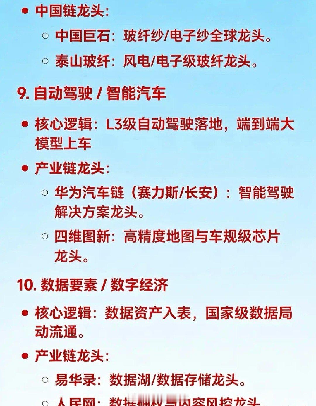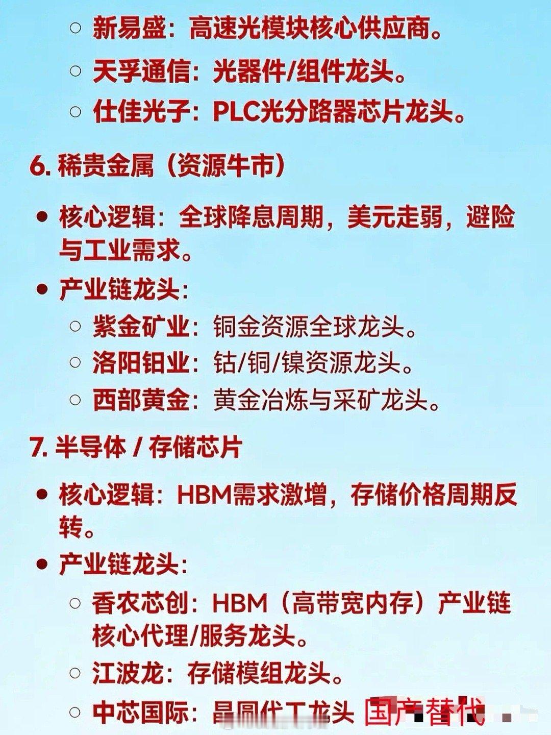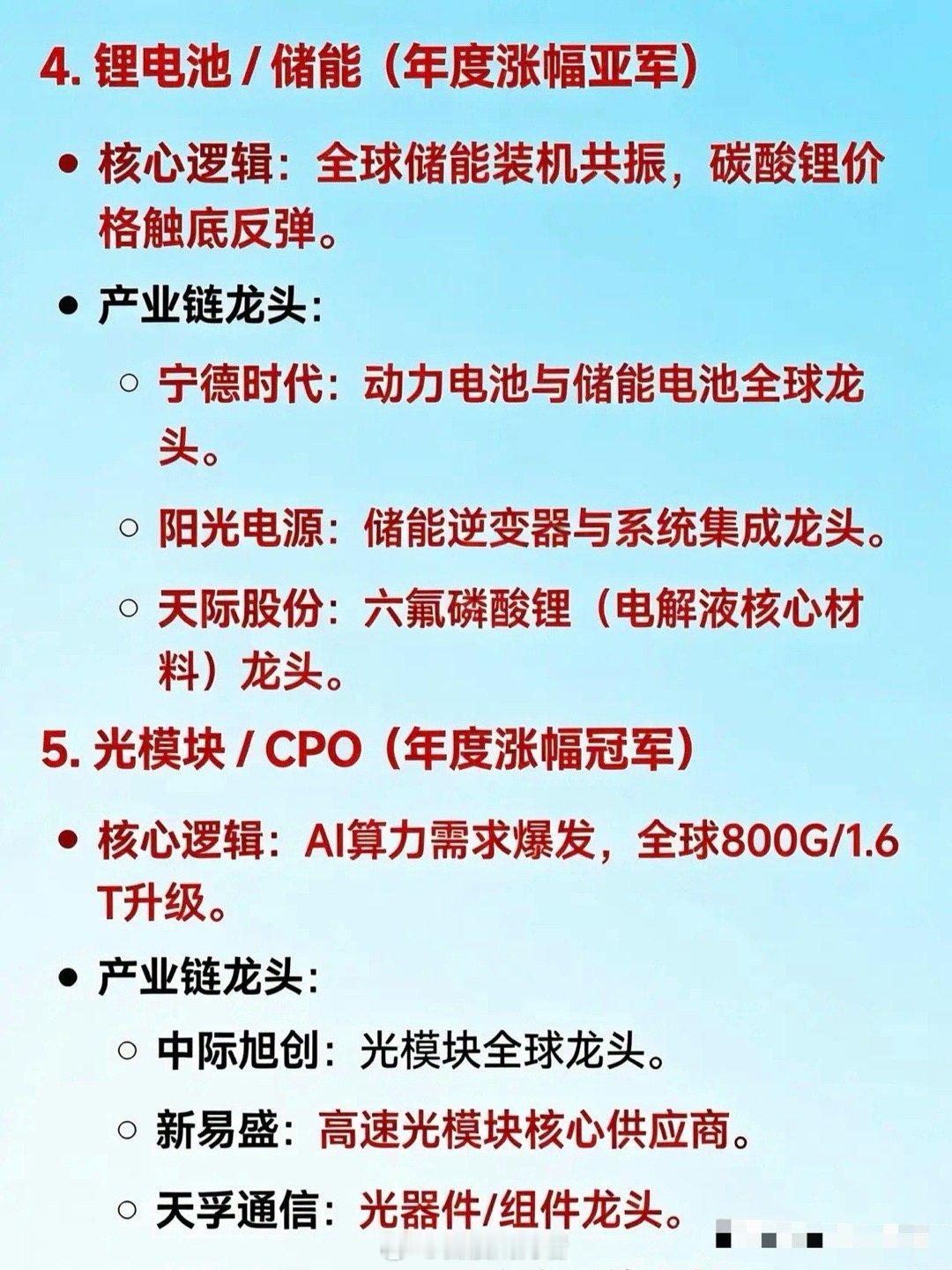 2025年12月31日十大热点概念及产业链龙头盘点,快来看看有没有你关注的领域:1. 商业航天(年末强势爆发)核心逻辑:卫星互联网组网进程加速,可回收火箭技术实现关键突破,行业迎来规模化发展契机。产业链龙头:• 航天宏图:卫星应用与遥感服务领域龙头,技术覆盖广、场景落地深。• 超捷股份:商业火箭结构件核心供应商,产品性能适配多型号火箭需求。• 斯瑞新材:液氧煤油发动机推力室材料龙头,为火箭动力系统提供关键支撑。2. AI智能体/应用(今日逆势走强)核心逻辑:大模型开源化推进,AI从工具属性向“智能代理”升级,应用场景加速落地。产业链龙头:• 蓝色光标:AI营销领军者,布局出海应用场景,技术与业务融合度高。• 易点天下:AI广告营销龙头,算法驱动精准投放,全球化服务能力突出。• 德生科技:AI政务与数据要素应用标杆,深耕民生服务场景数字化。3. 人形机器人(量产元年启动)核心逻辑:特斯拉量产计划临近,国产整机及核心零部件替代进程提速。产业链龙头:• 拓普集团:机器人执行器与旋转关节龙头,技术适配人形机器人运动需求。• 三花智控:聚焦机器人热管理与机电执行器,核心部件性能领先。• 五洲新春:丝杠、轴承等核心部件龙头,为机器人精密运动提供支撑。4. 锂电池/储能(年度涨幅亚军)核心逻辑:全球储能装机量共振增长,碳酸锂价格触底反弹,行业景气度回升。产业链龙头:• 宁德时代:动力电池与储能电池全球龙头,技术与产能规模双领先。• 阳光电源:储能逆变器及系统集成龙头,全球化布局优势显著。• 天际股份:六氟磷酸锂(电解液核心材料)龙头,受益于电解液需求回暖。5. 光模块/CPO(年度涨幅冠军)核心逻辑:AI算力需求爆发,全球800G/1.6T光模块升级潮来临,行业量价齐升。产业链龙头:• 中际旭创:光模块全球龙头,高速产品出货量领先。• 新易盛:高速光模块核心供应商,深度参与全球算力网络建设。• 天孚通信:光器件/组件龙头,产品覆盖全产业链关键环节。• 仕佳光子:PLC光分路器芯片龙头,技术壁垒高。6. 稀贵金属(资源牛市延续)核心逻辑:全球降息周期开启,美元走弱推动贵金属避险需求上升,叠加工业用金需求增长。产业链龙头:• 紫金矿业:铜、金资源储备与产能全球领先,多元化布局抗风险能力强。• 洛阳钼业:钴、铜、镍等关键金属龙头,受益于新能源产业链需求。• 西部黄金:黄金冶炼与采矿龙头,业绩与金价联动性高。7. 半导体/存储芯片核心逻辑:HBM(高带宽内存)需求激增,存储芯片价格进入周期反转通道。产业链龙头:• 香农芯创:HBM产业链核心代理与服务商,深度绑定上游芯片厂商。• 江波龙:存储模组龙头,产品覆盖消费级与工业级市场。• 中芯国际:晶圆代工国产替代龙头,先进制程与成熟制程同步推进。8. 玻璃纤维核心逻辑:风电大型化拉动高端玻纤需求,供给端收缩优化行业竞争格局。产业链龙头:• 中国巨石:玻纤纱、电子纱全球龙头,产能与技术优势显著。• 泰山玻纤:聚焦风电、电子级玻纤领域,产品附加值高。9. 自动驾驶/智能汽车核心逻辑:L3级自动驾驶逐步落地,端到端大模型上车加速,行业进入技术变现期。产业链龙头:• 华为汽车链(赛力斯/长安):智能驾驶解决方案龙头,软硬件一体化能力突出。• 四维图新:高精度地图与车规级芯片龙头,为自动驾驶提供核心数据与硬件支撑。10. 数据要素/数字经济核心逻辑:数据资产入表落地,国家级数据局推动数据流通体系建设,行业进入发展快车道。产业链龙头:• 易华录:数据湖与数据存储龙头,构建海量数据存储与运营生态。• 人民网:数据确权与内容风控龙头,在数据合规领域具备权威性。以上内容整理自公开信息,不构成投资建议,仅供行业趋势参考。