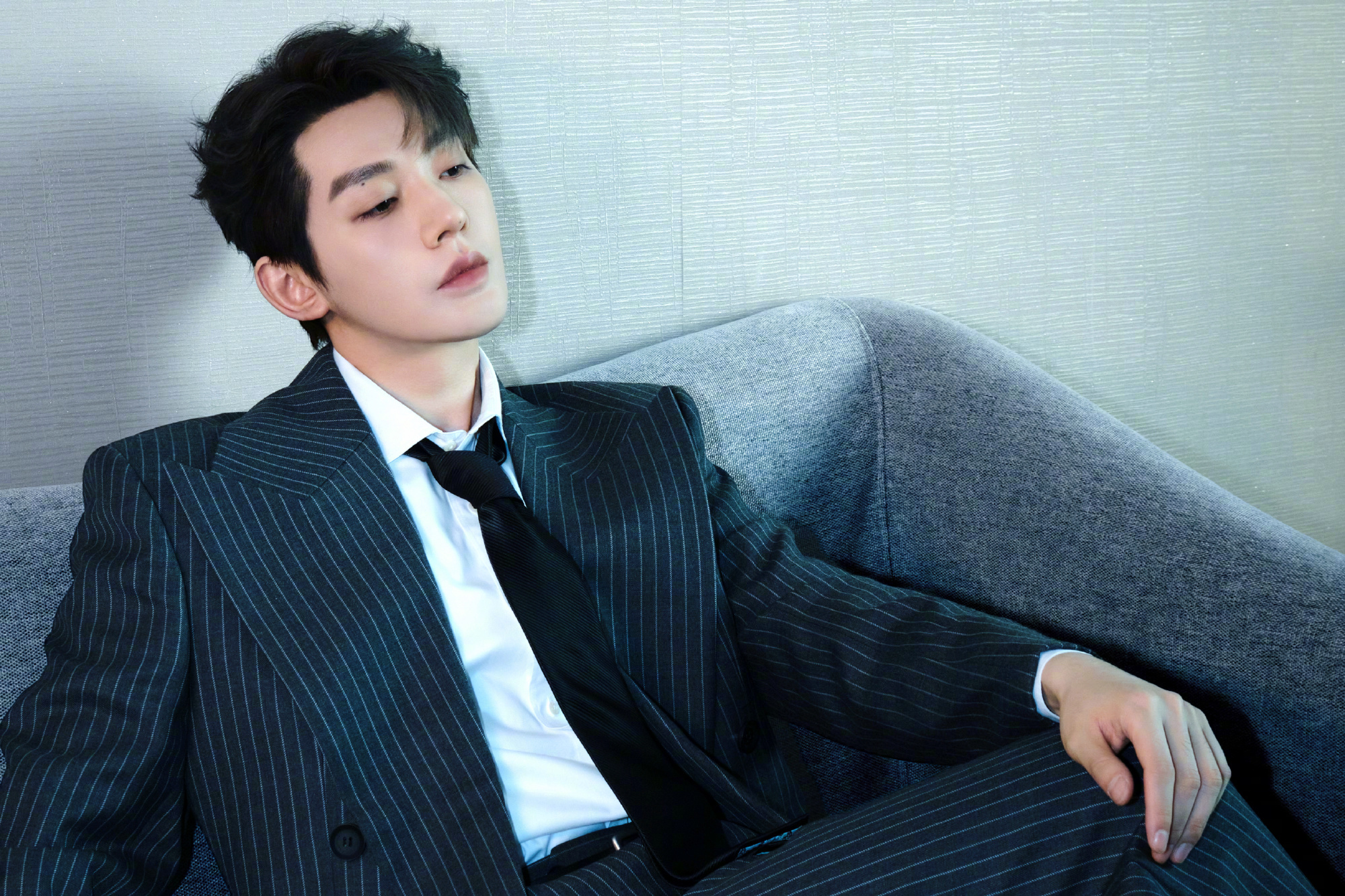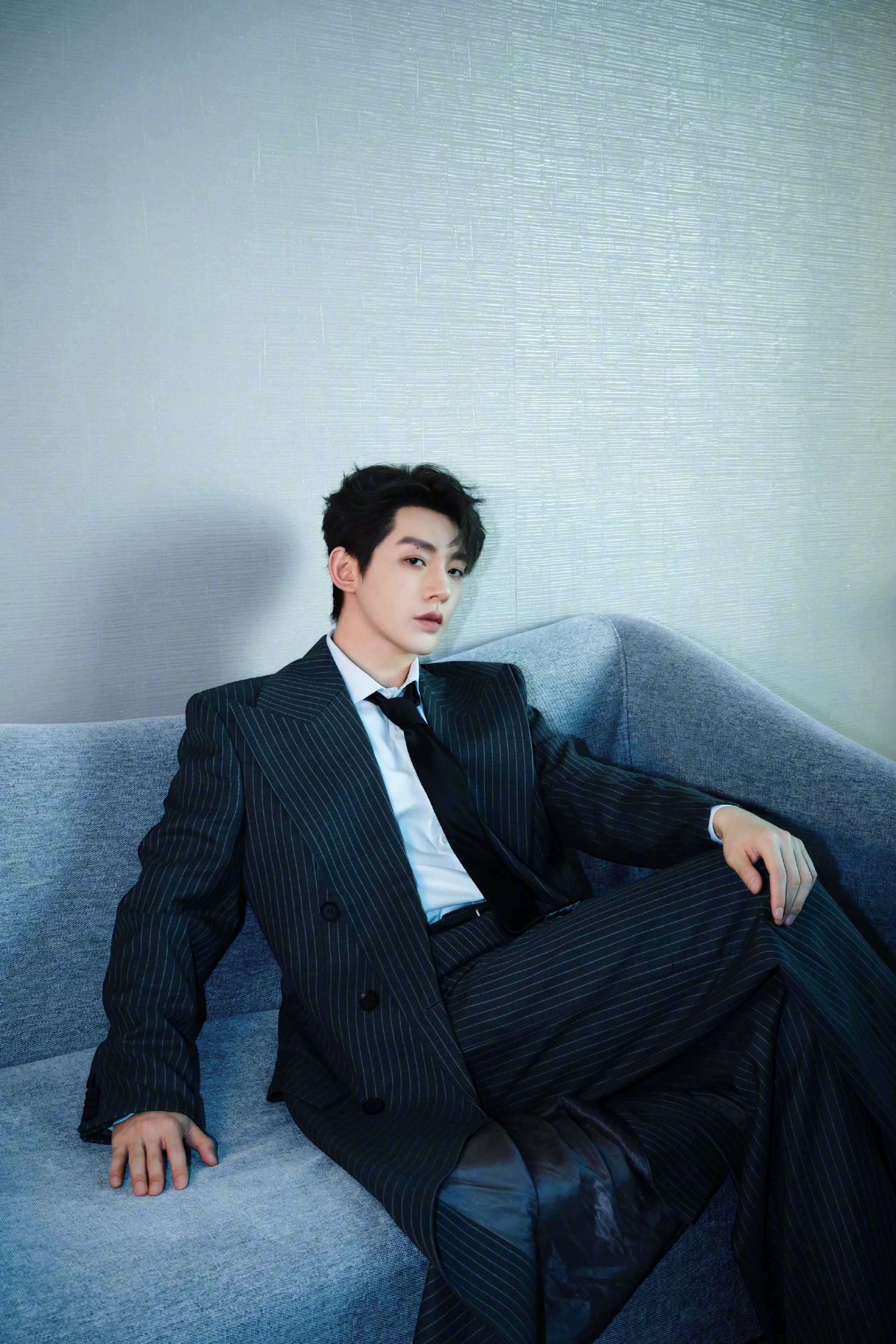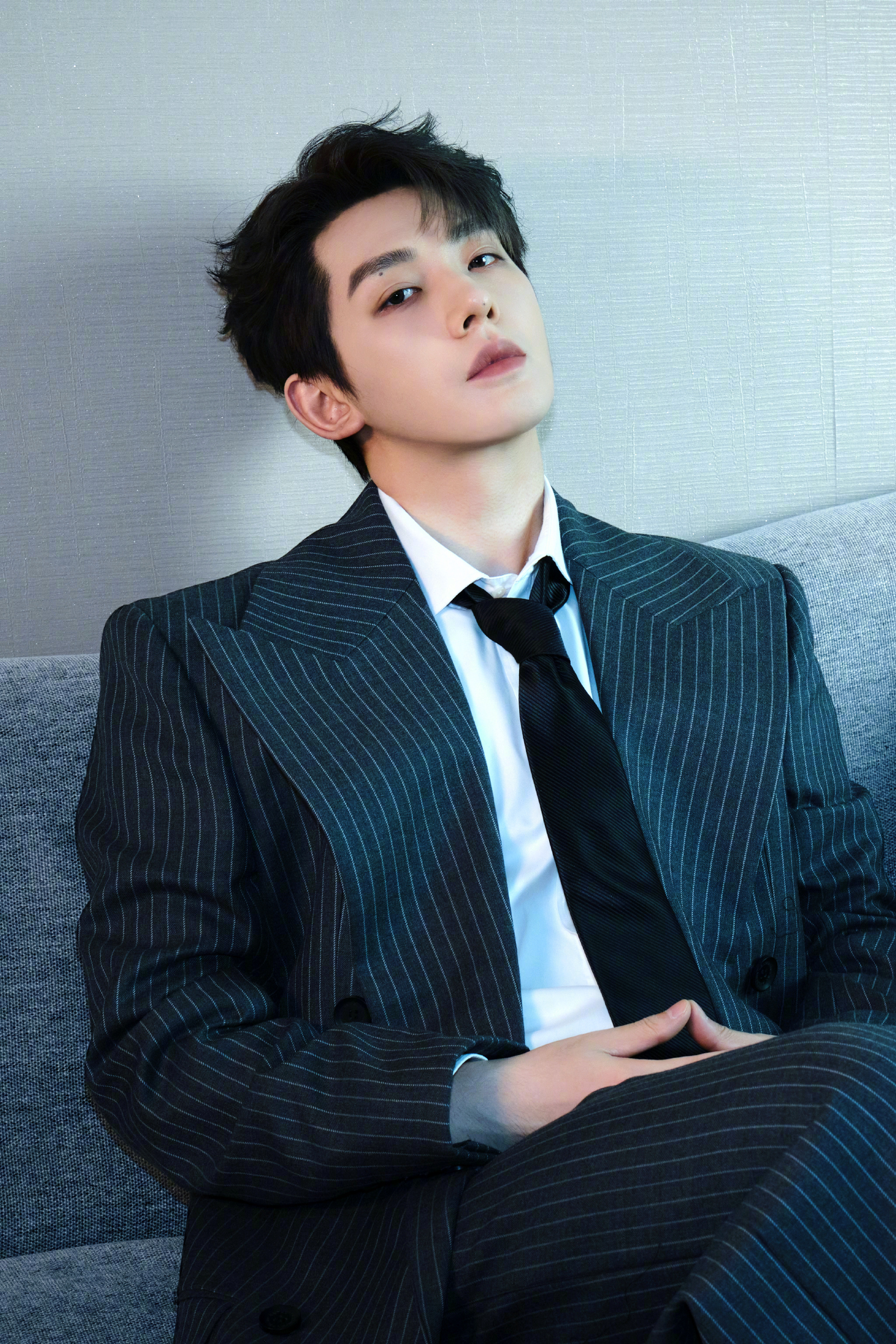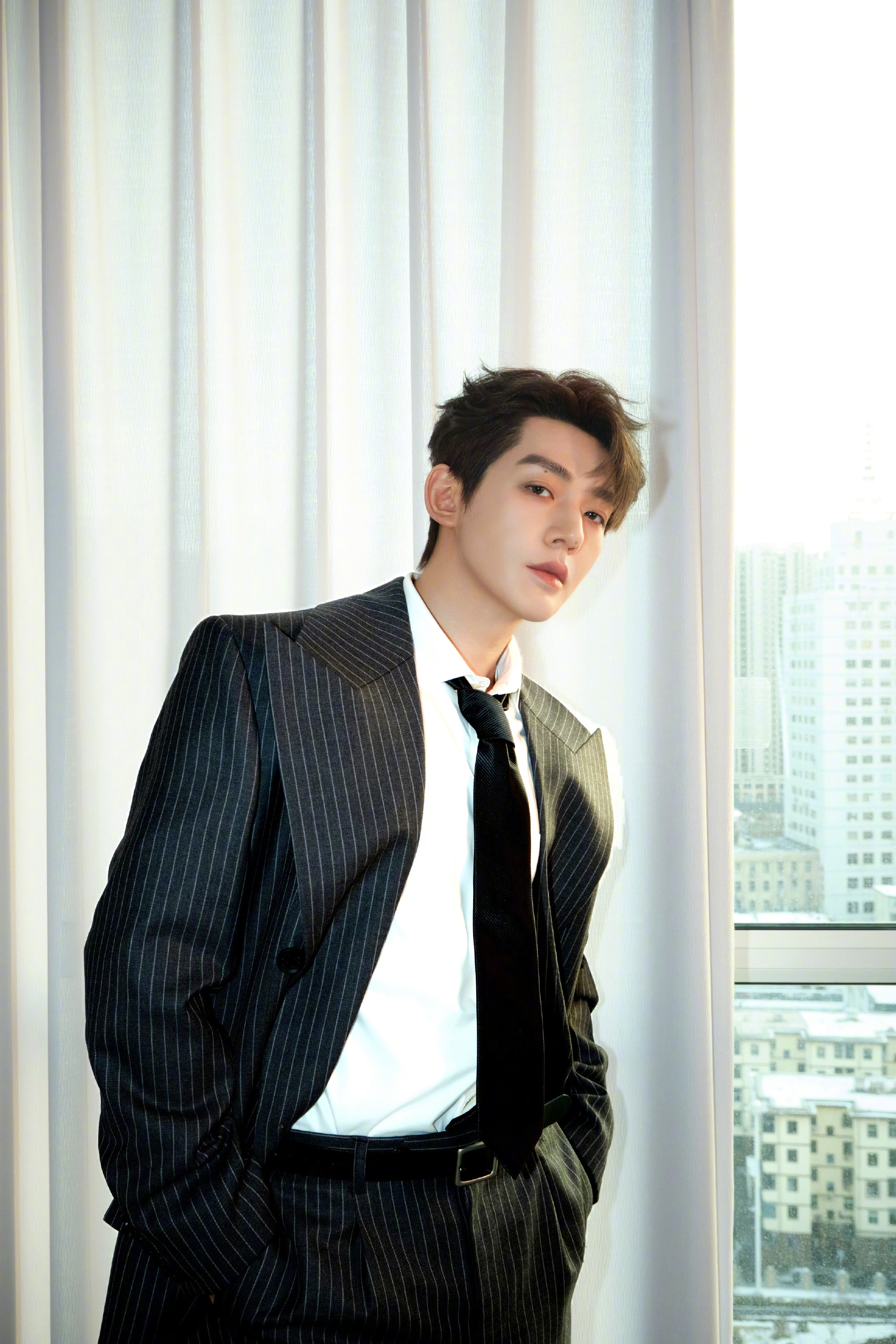 邓为 今晚 造型图,作为首登央视跨年的舞台,身穿条纹廓型西服套装,随性的领带和白衬衫,不需过多修饰,主打简约松弛风格。