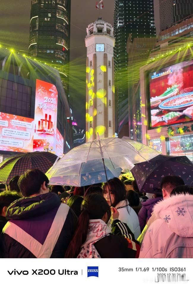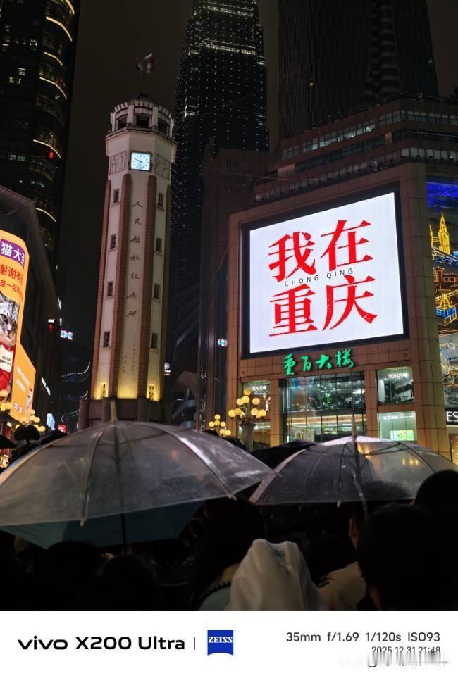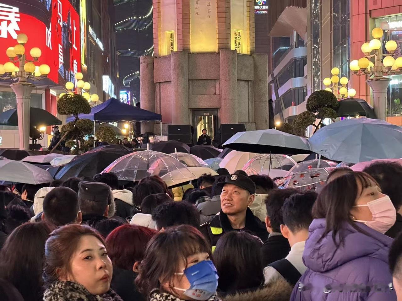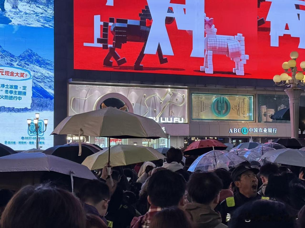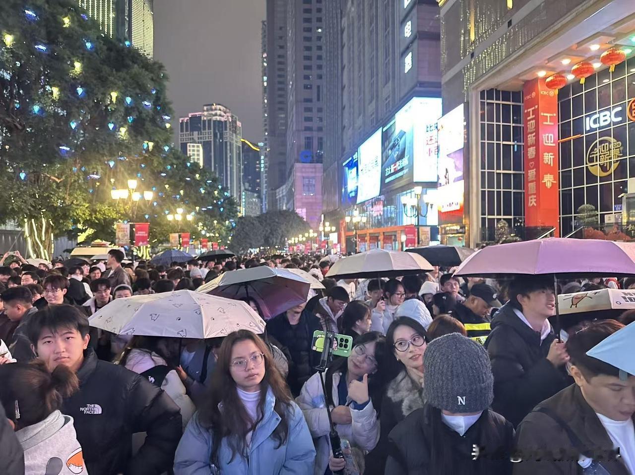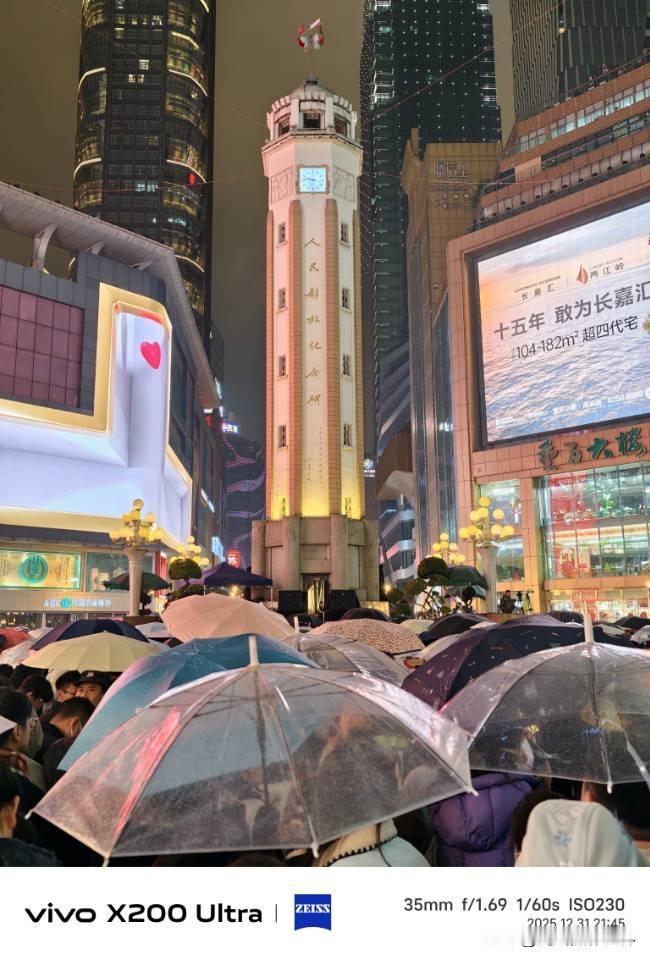 12月31日晚上9点50,重庆解放碑下起雨,大家纷纷打起雨伞!哎哟!今年跨年夜,真的太难了!在场的人,大多数已经一动不动站了两个多小时了!这又下起雨,真的好想放弃啊!啊啊啊!2026年1月1日凌晨0点0分的新年钟声,快快点敲响吧!2025年快点结束吧!哎哟!今晚上的重庆无人机灯光秀,会不会推迟或者取消啊?大家真的忐忑不安啊!已经废了这么大的劲,吃了这么难熬的苦,不甘心现在就放弃啊!可是,咬咬牙,坚持下去,就怕万一……前功尽弃啊!