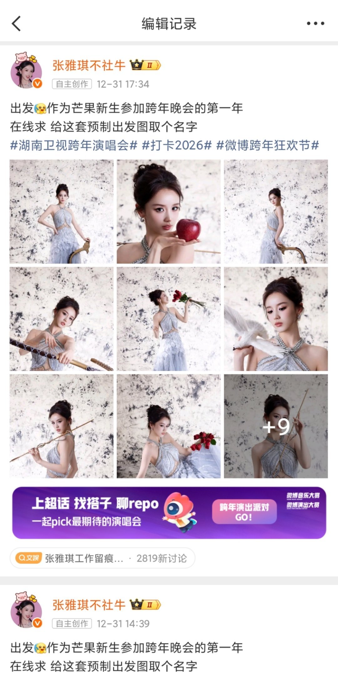 张雅琪工作留痕这招用到跨年晚会了张雅琪也是学会工作留痕了 不光发了满满18宫格,还在线向网友征集跨年晚会造型图的命名,谁说这不是另一种灵感源泉呢