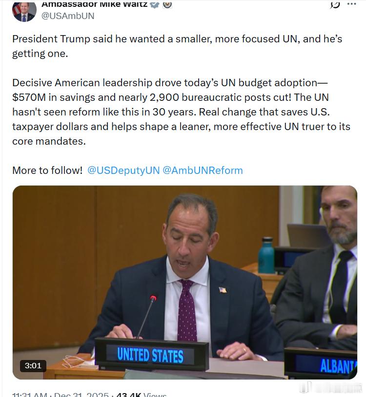 美国驻联合国大使麦克·沃尔茨:特朗普总统表示他希望联合国更加精简、更有重点,而他正在实现这一目标。美国果断的领导力推动了今天联合国预算的通过——节省了5.7亿美元,并削减了近2900个官僚职位!联合国已经30年没有见过这样的改革了。这是真正的变化,不仅节省了美国纳税人的钱,还帮助塑造了一个更加精简、更有效、更符合其核心任务的联合国。
