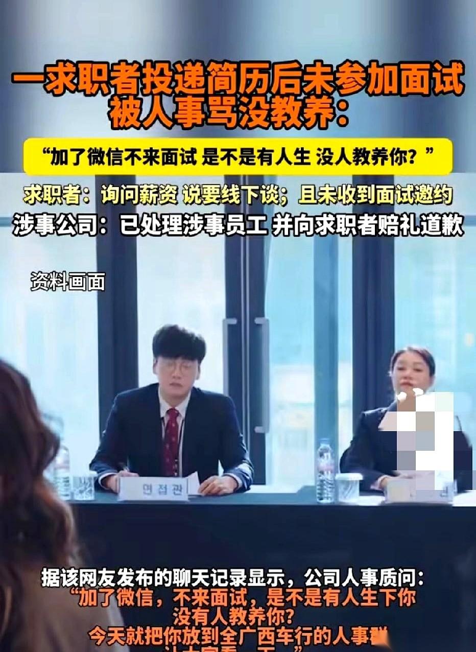 “信不信我把你的简历、手机号全发到行业群,让你在南宁汽车圈,以后都找不到工作!” 妈呀,我刚看到这条消息的时候,手都气抖了。 这得多大的官威啊?一个公司HR,不知道的还以为是掌管生杀大权的黑社会呢。 事情其实简单得可笑。 一个南宁的姑娘,投了份简历。HR加了微信,姑娘就特有礼貌地问了句薪资范围,想心里有个底。 结果呢?人家就回了冷冰冰五个字:“线下面谈。” 没时间,没地点,没下文。 这不就是职场PUA的老套路吗?把你骗过去,看你来都来了,路费时间都花了,再狠狠杀价。谁还上这个当啊? 姑娘觉得没谱,就没再追问。 结果第二天,好戏来了。 这位HR直接开骂:“是不是有人生,没人教养。” 我真是……大开眼界。你连面试邀请都没正式发一个,凭什么要求人家必须到场?你是老板还是人家爹妈啊? 姑娘好声好气解释,说面试是双向选择,薪资都不知道,没必要白跑一趟。 然后,就收到了开头那条,足以把人饭碗都砸了的威胁。 真的,看到这里,我一点都不觉得是那个求职姑娘的委屈了,我只觉得恶心。 这年头,找个工作怎么跟闯关打怪一样,还得渡劫? 总有那么些人,手里捏着一丁点儿权力,就真把自己当天王老子了,觉得求职者就该摇着尾巴来乞讨。 问薪资,就是你眼高手低;想准点下班,就是你不能吃苦;稍微有点自己的想法,就是你这人不好管。 去你的吧。 工作是双向奔赴,不是谁对谁的施舍。你招人,我找活,我们是平等的。连最基本的尊重都没有,还开什么公司,招什么人? 还好,这事儿最后闹大了,公司把那个HR开了,道了歉。 解气是真解气。 但说白了,这种事,绝不是个例。希望每个打工人都能挺直腰杆,也希望那些“覃人事”们能明白一个道理: 出来混,迟早是要还的。桌子不大,别把自己那盘菜摆得太中间了。