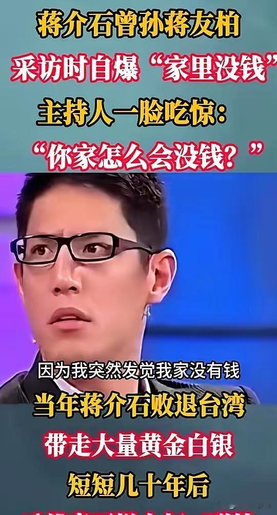 蒋家后代蒋友柏接受采访,主持人问,那两年你躲在什么地方去了?他说其实那几年在纽约。主持人,那你在纽约做什么?赚钱,那两年我拼了命赚钱。为什么,我突然发现,我家里没钱。蒋家后人真帅!至少让我们明白了,他是靠自己在赚钱。图片素材来自网上