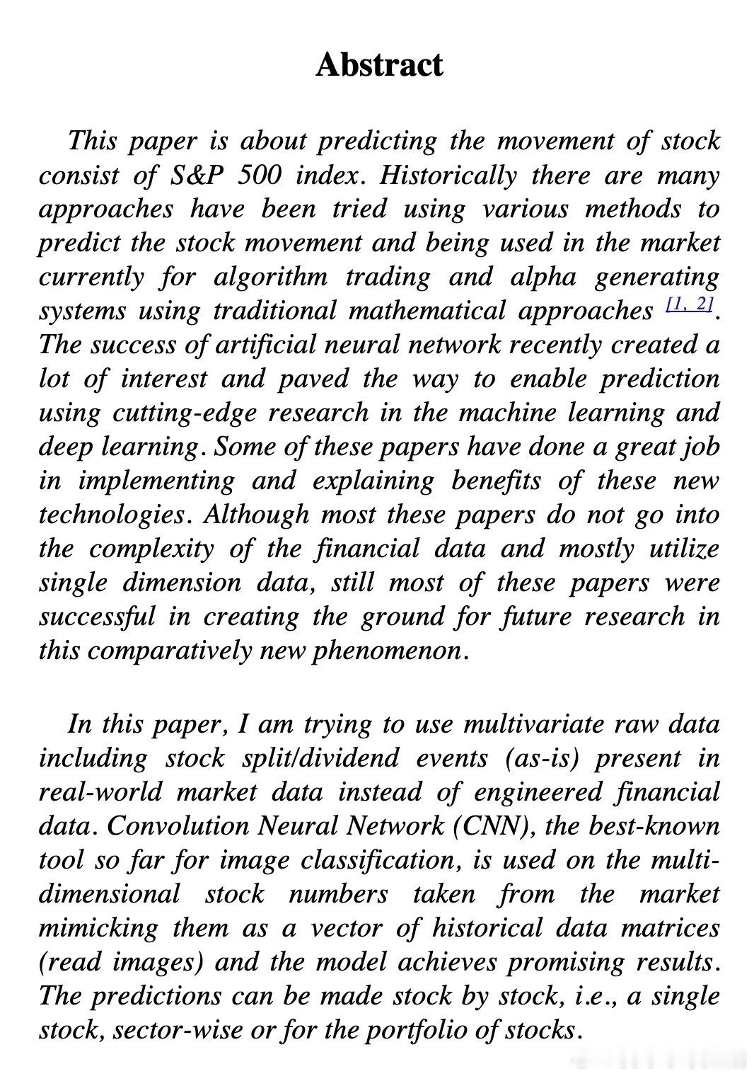 [LG]《S&P 500 Stock's Movement Prediction using CNN》R Gupta [Stanford University] (2025) 股市预测被公认为时间序列预测中最具挑战性的“圣杯”。Rahul Gupta 在其研究中提出了一种新的视角:利用原本用于图像识别的卷积神经网络(CNN),来捕捉金融市场中复杂且非线性的波动规律。传统预测往往依赖于人工设计的金融指标,但这往往会丢失原始数据的细微特征。本研究的突破点在于直接使用“原汁原味”的多维原始数据,包括开盘价、最高价、最低价、收盘价及成交量(OHLCV),以及经过复权调整后的对应数据。为什么选择 CNN 而非更常见的 LSTM?虽然 LSTM 擅长处理时间序列,但其训练成本高昂且难以捕捉空间特征。CNN 则能将历史价格矩阵视为“图像”,通过卷积层高效提取市场在空间维度上的相关性,在处理高噪声、高波动的金融数据时表现出更强的鲁棒性。数据处理的艺术在于对现实复杂性的包容。模型不仅使用了长达 8 到 24 年的历史数据,还特别引入了分红和拆股事件。通过滑动窗口技术进行数据增强,模型得以在海量样本中学习这些复杂金融事件对股价产生的深层影响。在架构设计上,该模型采用了 10 层深度网络,结合了 Leaky RELU 激活函数与 Batch Normalization 层,最终通过 Softmax 分类器输出看涨或看跌的概率。这种设计让模型既能敏锐捕捉短期趋势,也能兼顾长期走势的稳定性。实验结果令人振奋。该模型在单只股票、特定行业乃至整个投资组合的预测上均表现出色。以摩根大通(JPM)为例,其预测准确率达到了惊人的 91%,显著优于传统的 ARIMA 模型及部分基准深度学习模型。深度思考:金融预测的本质并非寻找绝对的确定性,而是捕捉概率的微小偏移。当我们将市场波动视为一种“视觉模式”而非简单的数字序列时,CNN 能够识别出人类专家难以察觉的微观结构。未来的量化交易将不再仅仅是数学公式的竞赛,而是感知维度的博弈。将 CNN 与处理记忆的 LSTM 以及分析情绪的 NLP 结合,构建一个融合基本面与技术面的多模态系统,将是通往更高预测精度的必经之路。原文链接:arxiv.org/abs/2512.21804