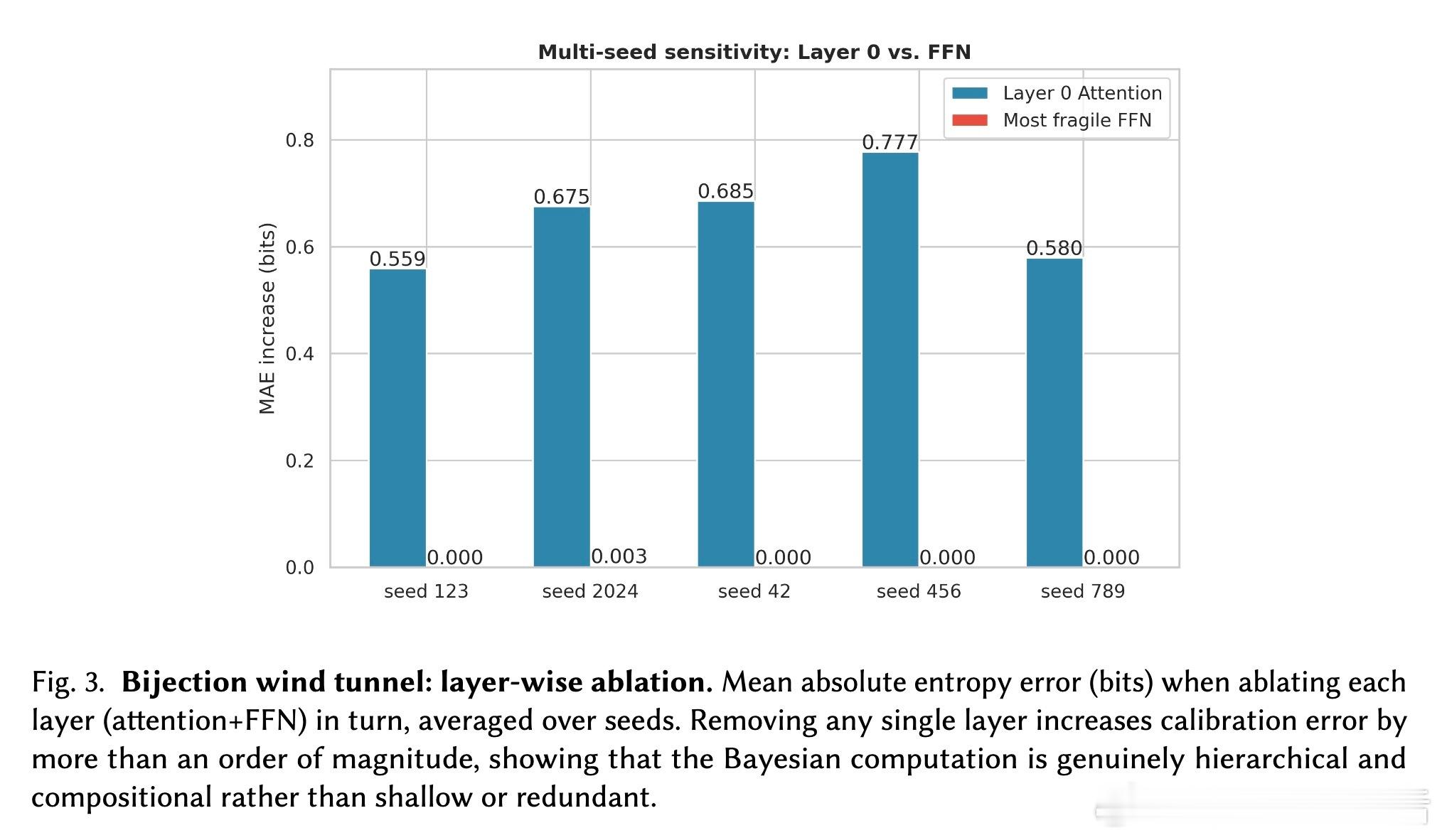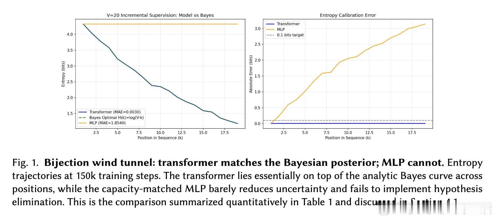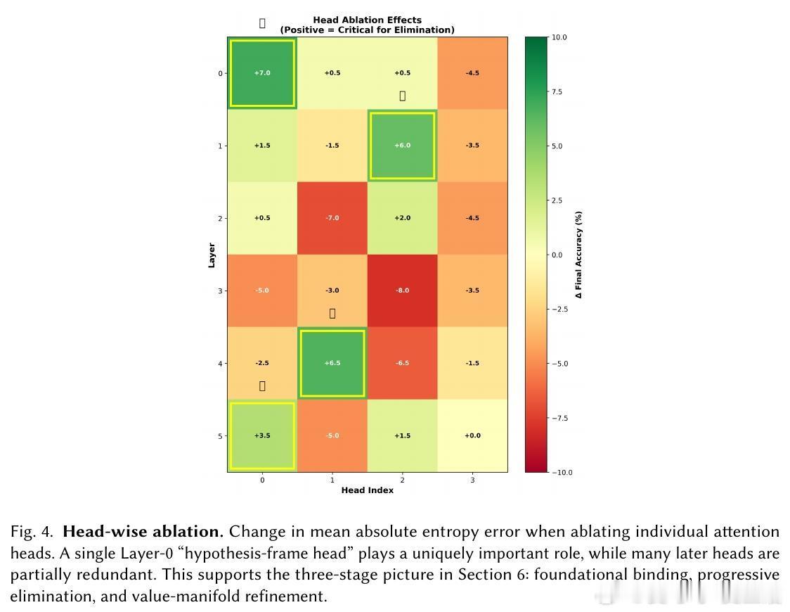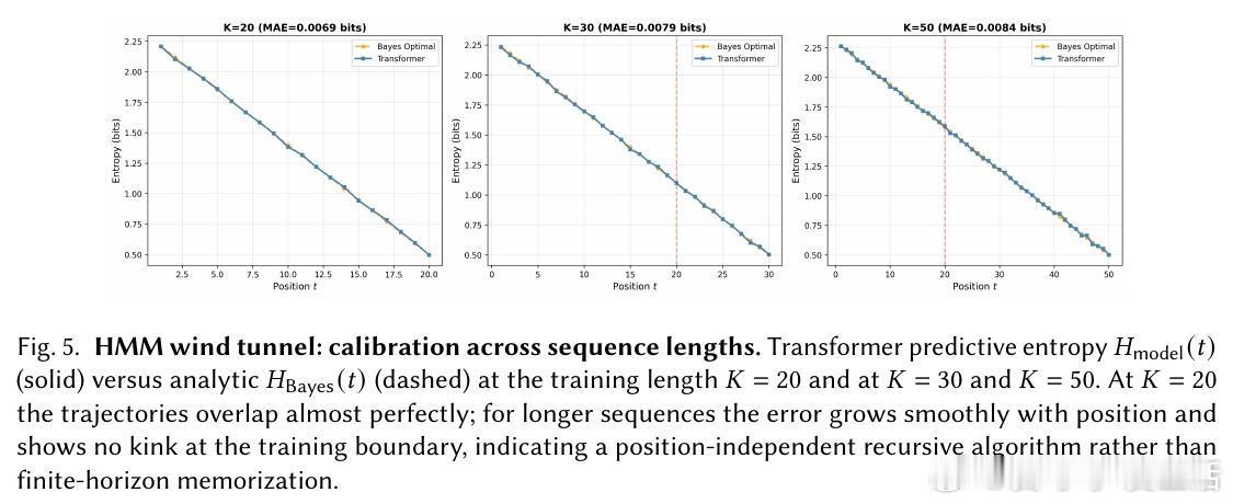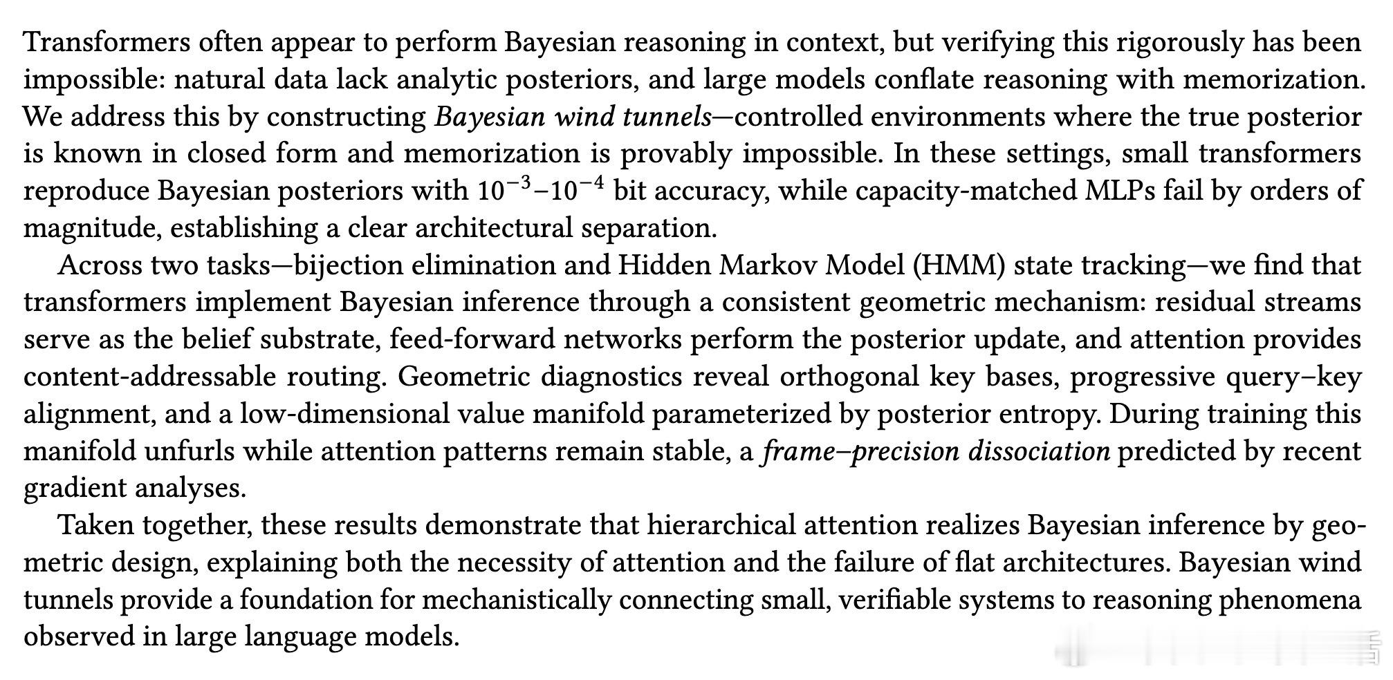 [LG]《The Bayesian Geometry of Transformer Attention》N Aggarwal, S R. Dalal, V Misra [Dream Sports & Columbia University] (2025) Transformer究竟是在进行真正的贝叶斯推理,还是仅仅通过模式匹配在“演”一种逻辑?长期以来,由于自然语言缺乏解析后验概率,我们无法区分模型是在进行概率计算还是在依赖记忆。这篇来自哥伦比亚大学等机构的论文《The Bayesian Geometry of Transformer Attention》通过构建“贝叶斯风洞”,为我们揭开了Transformer内部几何设计的奥秘。什么是“贝叶斯风洞”?研究者设计了两个受控环境:双射学习和隐马尔可夫模型(HMM)状态跟踪。在这些环境中,真实的后验概率有精确的闭式解,且假设空间巨大,模型绝无可能通过记忆过关。这把一个模糊的定性问题转化为了定量测试:模型的预测熵是否在每一个位置都与解析后的贝叶斯熵吻合?实验结果令人震撼。仅有200万参数的小型Transformer在预测精度上达到了10^-3至10^-4比特的极高准确度,几乎与数值计算的误差相当。相比之下,参数量完全匹配的MLP在同样的任务中彻底溃败。这证明了Transformer的成功并非单纯来自规模,而是源于其独特的架构偏置。Transformer是如何在内部实现贝叶斯的?研究揭示了一个清晰的三阶段几何机制:第一阶段,基础绑定(Layer 0)。Layer 0的注意力机制通过正交的Key向量构建了一个“假设框架”。这相当于在残差流中建立了一套坐标系,为后续的推理提供了结构化的基质。第二阶段,序列消除(中间层)。随着深度增加,Query和Key的对齐变得越来越尖锐。这在几何上对应于贝叶斯更新中的“证据集成”:模型逐层剔除不符合观察结果的假设,将注意力集中在可行的子空间。第三阶段,精度精炼(顶层)。在路由结构稳定后,最后的层级在低维流形上展开,对后验概率进行微调。研究发现,价值空间(Value-space)会演化成一个由后验熵参数化的平滑流形。这里有一个深刻的洞察:框架与精度的解耦。在训练过程中,注意力模式(路由)会较早稳定下来,确定“信息去往何处”;而价值表征(精度)则会持续演化,直到能精确编码信念的细微差别。这种“先定框架,再磨精度”的动力学过程,解释了Transformer处理复杂推理时的稳健性。为什么MLP会失败?因为MLP缺乏内容寻址的路由能力和残差组合性。贝叶斯推理本质上是一个层次化的精炼过程,Transformer通过残差流承载信念状态,通过FFN执行数值更新,通过注意力进行内容寻址。这种几何设计与贝叶斯公式的结构达成了完美的同构。这项研究为我们理解大模型提供了一个“可验证的下限”。如果一个模型在闭式解明确的风洞中都无法实现贝叶斯,那么它在处理自然语言时的逻辑便不可信。Transformer的成功告诉我们,推理不仅仅是数据的堆砌,更是几何上的必然。论文链接:arxiv.org/abs/2512.22471