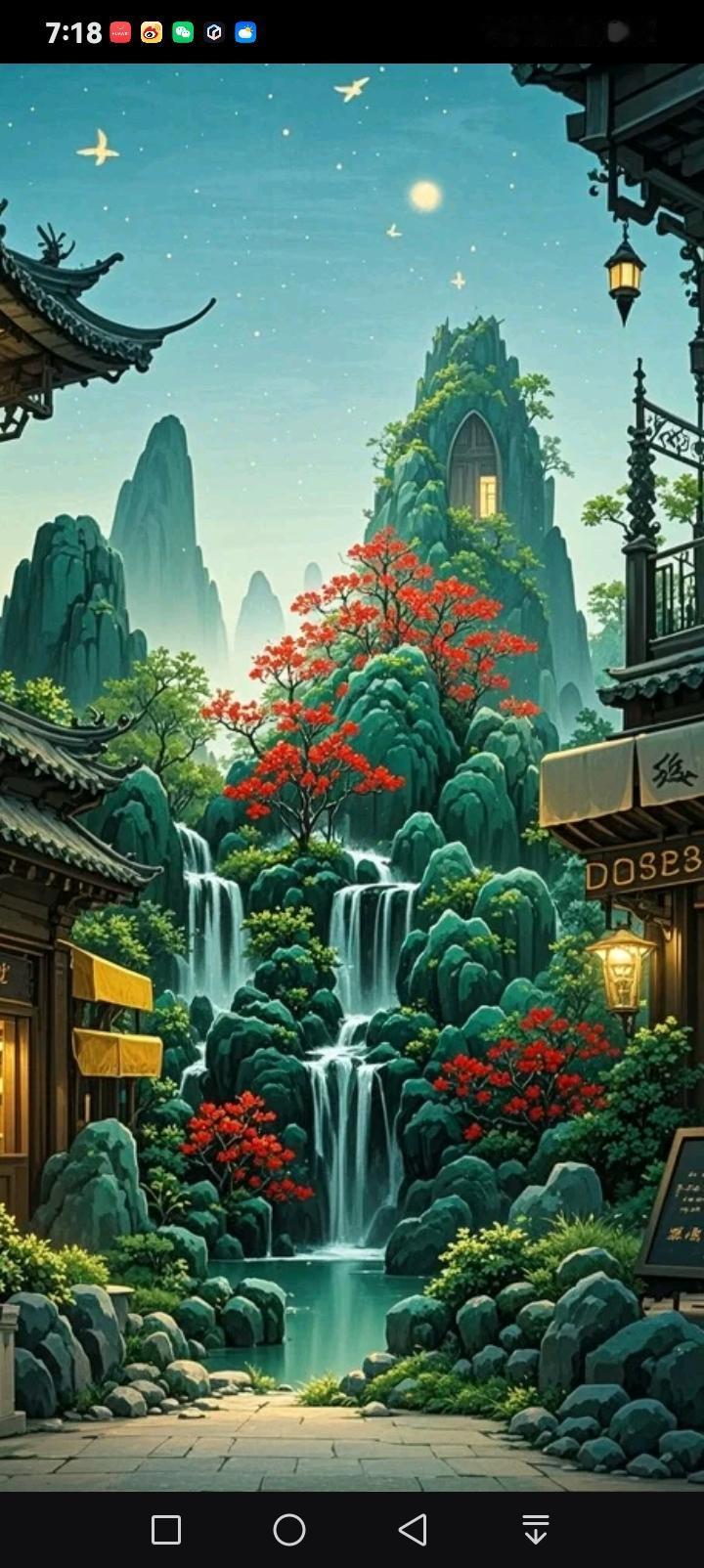 月色漫过青黛山峦,飞瀑叠翠溅起碎玉流光,红枫枝桠挑着星子,古檐翘角勾住晚风。巷陌石阶印着温润的光,灯笼摇出暖黄的晕,此间山水似把江南的灵秀揉进仙踪,抬眼是星河垂落,低眉是泉响潺潺,只觉心也随这景致,落得一片清宁。