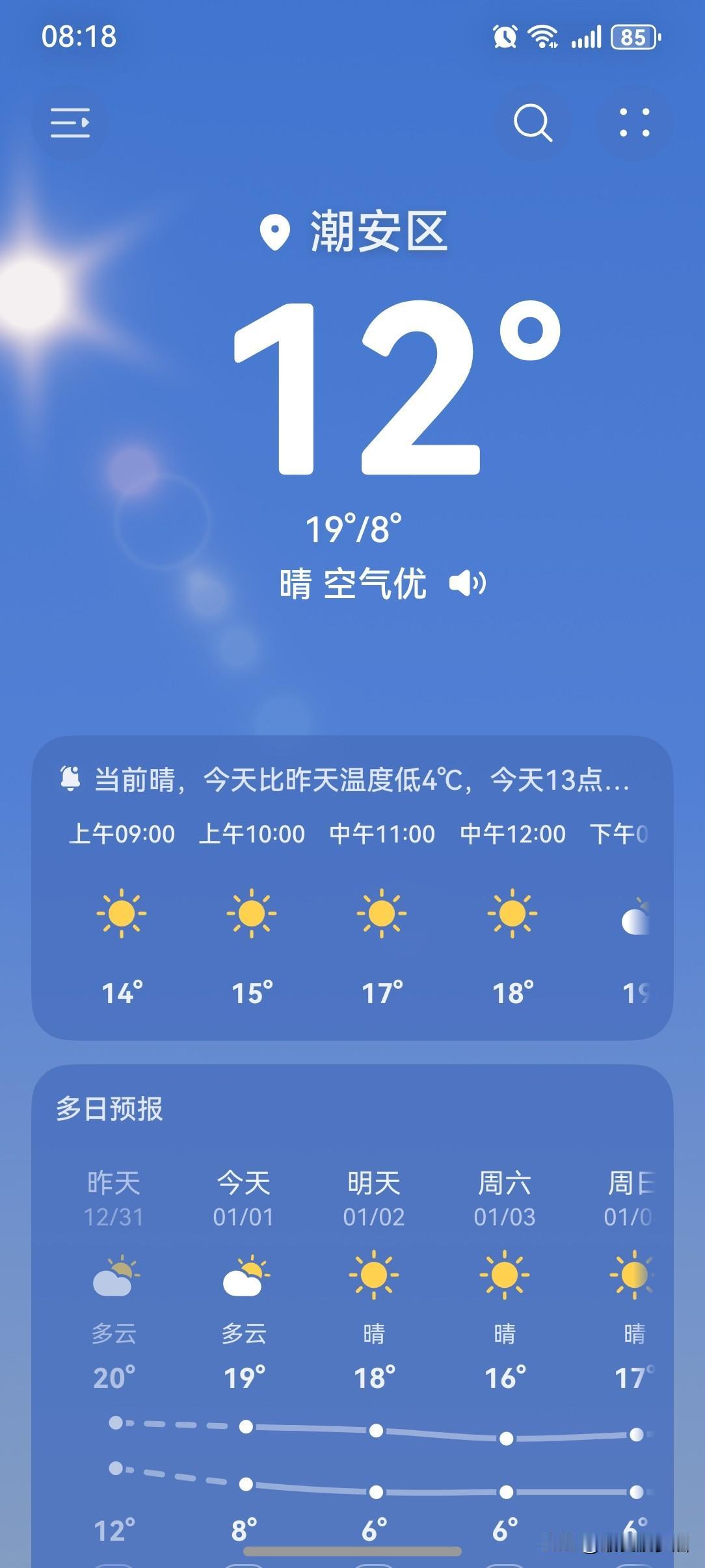 新年的钟声已经敲响,2026年来啦!新的一年新的开始!祝所有小伙伴们在新的一年里,平平安安!健健康康!快快乐乐!万事顺遂! 我们不仅迎来了崭新的一年,同时也迎来了一股崭新的冷空气! 广东气温"跳水"啦!冷空气前锋于1日早晨开始影响粤北、傍晚前后到达广州、夜间到达南部沿海,中北部市县气温下降7~9℃、南部下降5~7℃。 元旦假期(1月1-3日),受较强冷空气影响,广东将有降温大风天气,1日阴天有分散小雨,2-3日多云到晴。 今天(1日),潮州喜提一个多云天气,气温8~19℃,此刻气温12℃,体感温度11℃。 早上起来发现气温还好,跟昨天差不多,冷空气应该还没有达到我们这边,还能再暖一下。 一起来看看今天的天空吧!阳光一大早开始上线营业,云量没有昨天那么多,但雾气却又重了几分。 阳光灿烂,气温还没开始下降,咱们就接着奏乐接着舞吧!舞到几时算几时。 今天的天气,就此刻还看,依然值得一个五星好评! 如此天气!元芳,你怎么看? [我想静静][捂脸][笑哭][我想静静][捂脸][笑哭][我想静静][捂脸][笑哭]