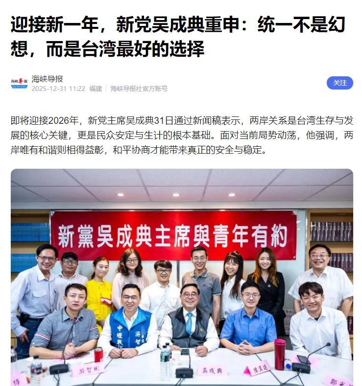 解放军围台期间,台湾新党主席吴成典出来说话了: 统一不是幻想,而是台湾最好的选择 马上要到2026年了,新党主席吴成典发新闻稿说,两岸关系直接关系到台湾能不能发展、老百姓日子能不能安稳。 现在局势乱,他觉得只有两岸好好相处、和平商量,才能真的安全稳定。这话太实在了,辞旧迎新的时候更能看清:统一不是空想,是让台湾人过上好日子的最好出路。 先说说赚钱的事,这是最实在的。这些年大陆一直是台湾最大的买家,台湾经济能撑住,全靠大陆市场。 2010年签的ECFA协议,就是大陆给台湾的实惠,到2023年底,台湾靠这个省了101亿美元关税,大陆才省了不到11亿。 这省下来的钱,最后都变成了台湾企业的利润,员工工资也能多发点,实实在在进了老百姓口袋。 很多台农在大陆都赚了钱,就是最好的例子。比如四川成都有个台商杨阿凯,把台湾的火龙果、凤梨带到大陆种,摸了两年门道就成功了,每亩地能赚10多万,水果根本不愁卖。 要是两岸关系紧张,这些合作根本搞不成。可民进党偏要搞“经济脱钩”,2025年上半年台湾对大陆出口跌了三成,塑料、化工这些行业跌得更厉害。 就因为他们不承认“九二共识”,台湾进不了区域经济组织,出口要多交税,企业没竞争力,工人就容易失业,这都是“台独”害的。 经济影响口袋,民生更关乎日常。现在台湾看病难、老人没人管、房价高、年轻人找工作难,就是因为民进党把民生的钱拿去买美国武器了。 前不久美国卖111亿美元武器给台湾,民进党还高兴得很,完全不管老百姓。2026年台湾预算里,教育、老人福利、基建的钱都砍了几百亿,全填了军火的坑,这样的日子谁能过得舒心? 反观在大陆的台胞,日子就不一样了。大陆给了很多优惠政策,台胞就业、看病、孩子上学都和大陆人一样。 比如有个台北女士去长沙开民宿,靠政策扶持生意特别好,还带动两岸年轻人交流。其实统一了,台湾人也能享受到这些好处,还能有真正的安全。 民进党喊着“以武谋独”,就是把台湾往火坑里推,美国只是把台湾当棋子,根本不会保护台湾,年轻人都不愿为“台独”当兵。 说到底,两岸本来就是一家人。吴成典一直推动两岸交流,让金门、马祖的人享受到了便利。 现在看得很清楚,“台独”只会让台湾经济差、日子过不好;统一了,台湾才能跟着大陆好好发展,老百姓日子才有盼头。 希望台湾同胞看清形势,别被“台独”骗了,和大陆一起把两岸关系搞好,早日统一,大家都能安稳过好日子。