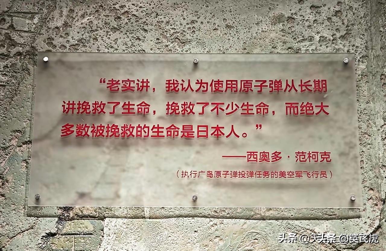 军事博物馆里的一个标牌。 这位美军飞行员说的好: 在日本扔原子弹 其实挽救的是 更多的日本人的生命[赞][赞]