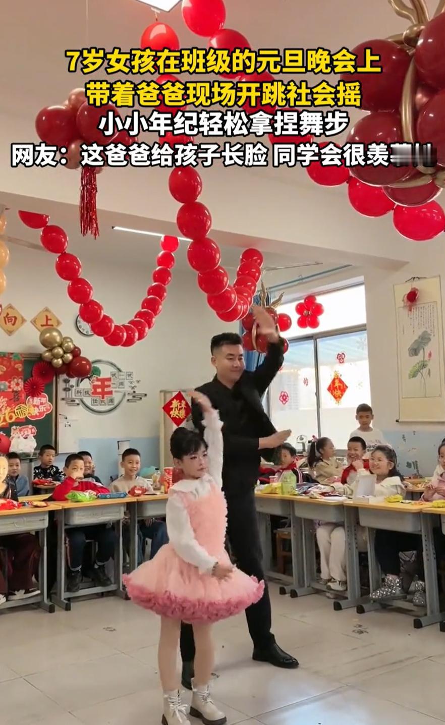辽宁,一小学举办跨年晚会,其中一位爸爸为了让7岁女儿在班级更出彩,直接跟着女儿一起表演“社会摇”,不过两人虽然表演的同步,也很出彩,但很多网友却表示:莫名的讨厌他是怎么回事? 视频中,七岁小姑娘和她的爸爸一起上了台。开始前父女俩还笑嘻嘻的,音乐一起,表情立刻认真了。两个人动作整齐划一,踩点精准,跳的是网上流行的那种“社会摇”。小姑娘年纪虽小,但架势一点不输,爸爸也跟得上节奏,看得出是花了时间在家练习的 班里的孩子看着,多少都会觉得新鲜,甚至有点羡慕。对一个小学生来说,能在台上被关注、被认可,本身就是一件挺开心的事 可问题也恰恰出在这里。很多网友说自己说不上来哪里不对,就是本能地有点反感 其实我觉得, 这种情绪不难理解。不是舞蹈本身有多出格,也不是父女同台有什么原则性问题,而是爸爸的存在感太强了。舞台原本是给孩子的,可当大人跳得太熟练、太用力,很容易从陪伴变成抢镜,哪怕他主观上只是想帮女儿一把 现在不少家长都很积极,积极参与孩子的生活、学习、活动,这本身没错。大家反感的,往往不是这个爸爸,而是那种替孩子把风头全包了的感觉。孩子需要被托一把,但也需要自己站一会儿 换个角度看,这位爸爸未必做错了什么。他愿意花时间陪练,愿意上台配合女儿,本身就说明他很在意孩子的感受。只是热闹之外,也提醒很多家长想一想,什么是陪伴,什么是代替。孩子在台上发光,哪怕动作没那么标准,可能反而更珍贵