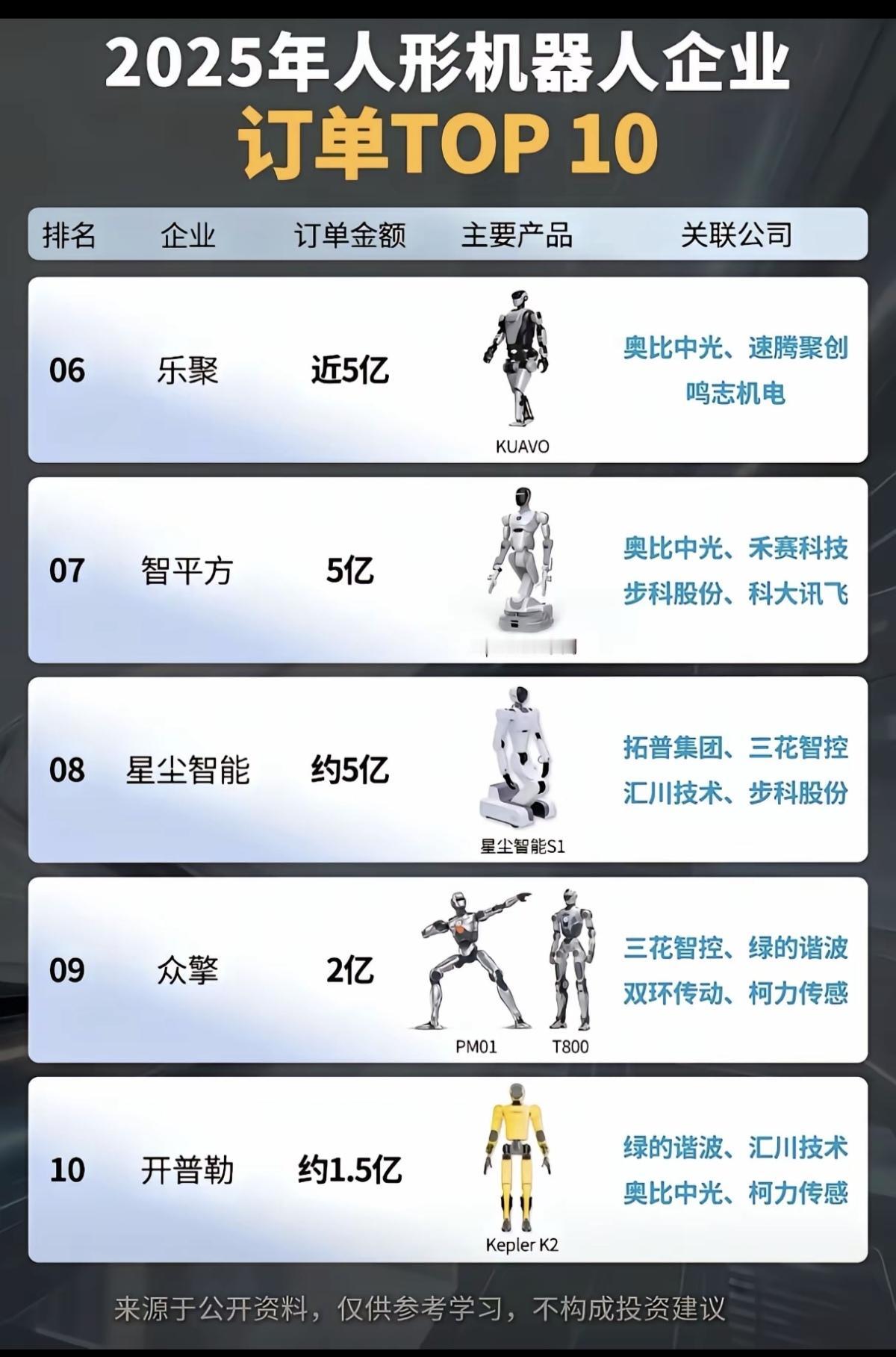 2025年人形机器人:企业订单TOP10! 订单排名: 第一名:优必选 第二名:宇树科技 第三名:越疆