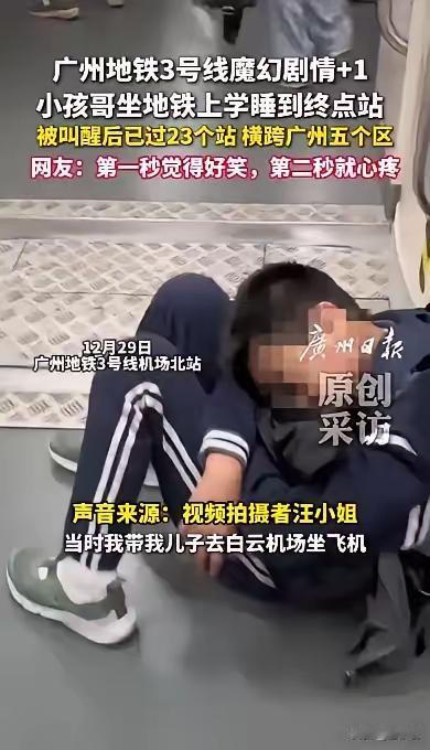 根本笑不出来!广东广州,一女子乘地铁去机场赶飞机,可在车厢中却发现一个背着书包,穿着校服的男子坐在地上睡觉,女子觉得不对劲,便上前询问,结果才知道男孩因为睡觉坐过了23个站。网友:笑着笑着哭了 广州地铁的末节车厢里,一个穿着蓝白校服的少年,正缩在冰冷的地板上睡得人事不省。 他的书包歪在一旁,拉链半开,露出几本卷了角的课本。若不是汪女士多留了个心眼,这孩子怕是要在空荡的车厢里,一直睡到天亮。 叫醒少年时,他的眼神还带着惺忪的迷茫。直到看清站台标识,才猛地拍了下大腿——自己本是要在汉溪长隆站下车上学,竟一觉睡过了23个站。 从番禺到白云机场,跨了五个行政区,在摇晃的地铁里睡了足足一个多小时。这哪里是睡过头,分明是累到了极致。 有网友说,这场景像极了自家的孩子。初一的娃,早上六点二十就得起床,晚上九点才放学,十点半能躺到床上已是奢侈。 周末补觉时,能从清晨睡到晌午,连饭都懒得起来吃。不是孩子懒,是真的熬不住了。 早晚高峰的公交地铁上,这样的身影随处可见。校服裹着单薄的身子,书包压弯了稚嫩的脊梁,他们闭着眼,连站着都能打盹。 这孩子的经历,带着几分荒诞的滑稽,却让人笑到一半就红了眼眶。早一刻或晚一刻被叫醒,对他而言不过是早一步或晚一步面对迟到的现实。 终究是要折腾着往学校赶,终究是要带着满身的疲惫,去面对新一天的课程。