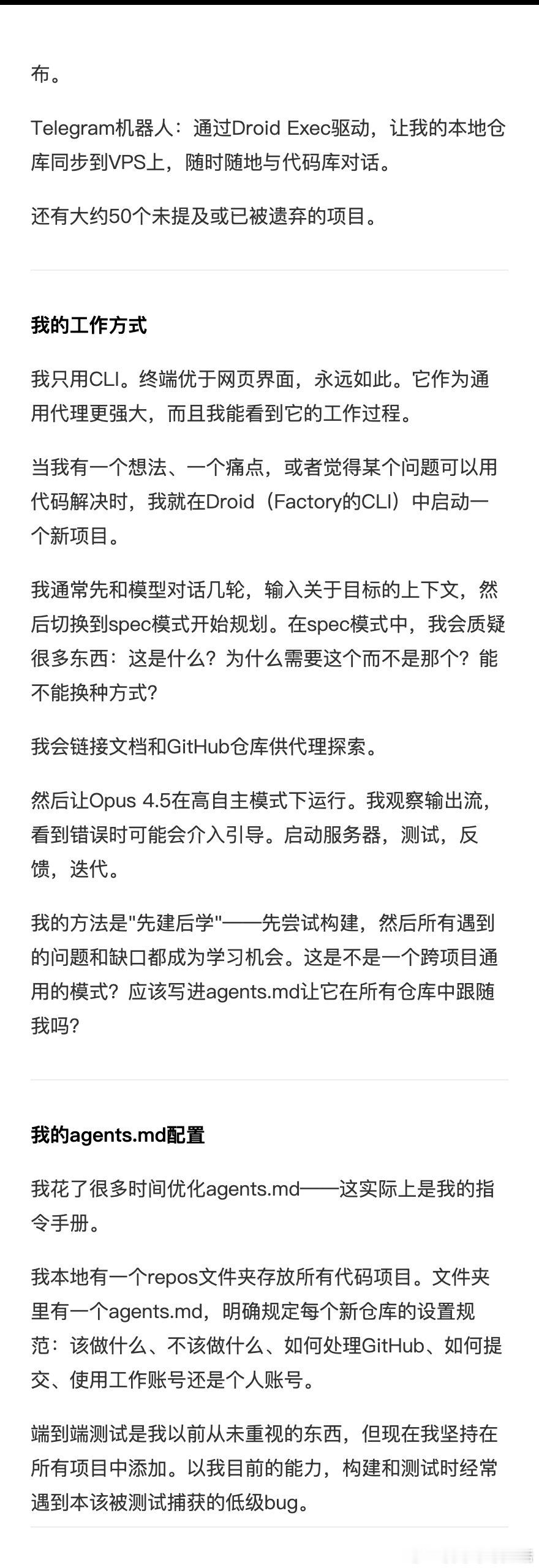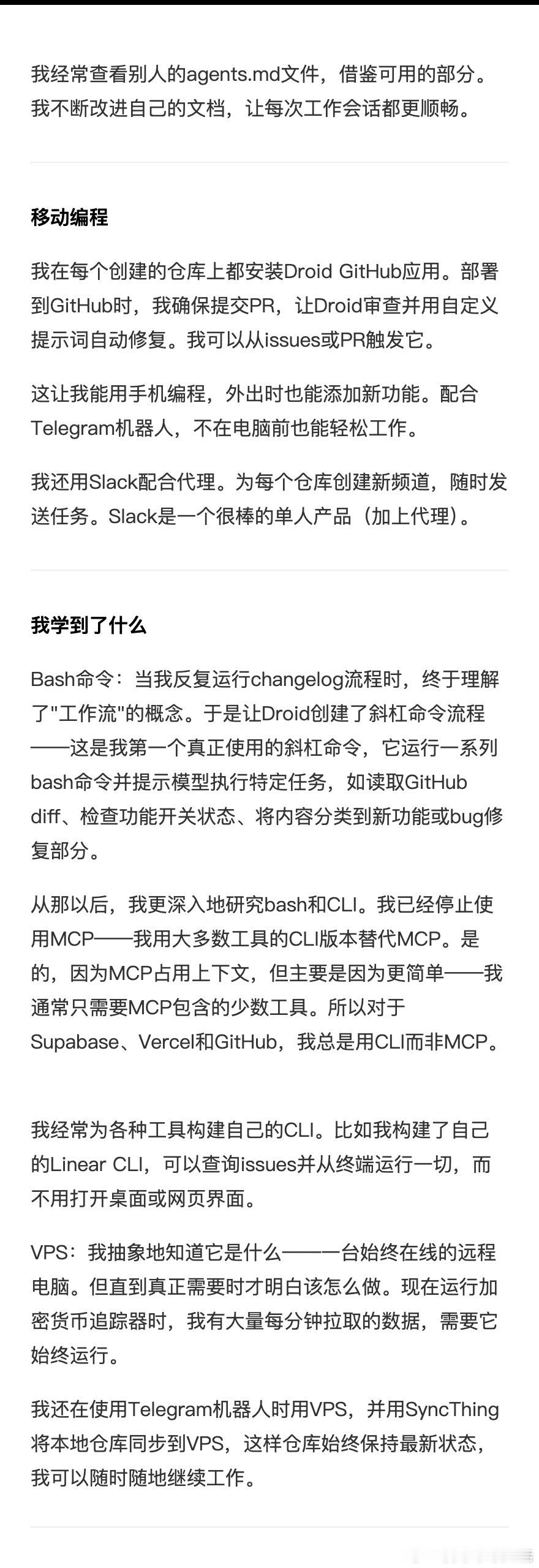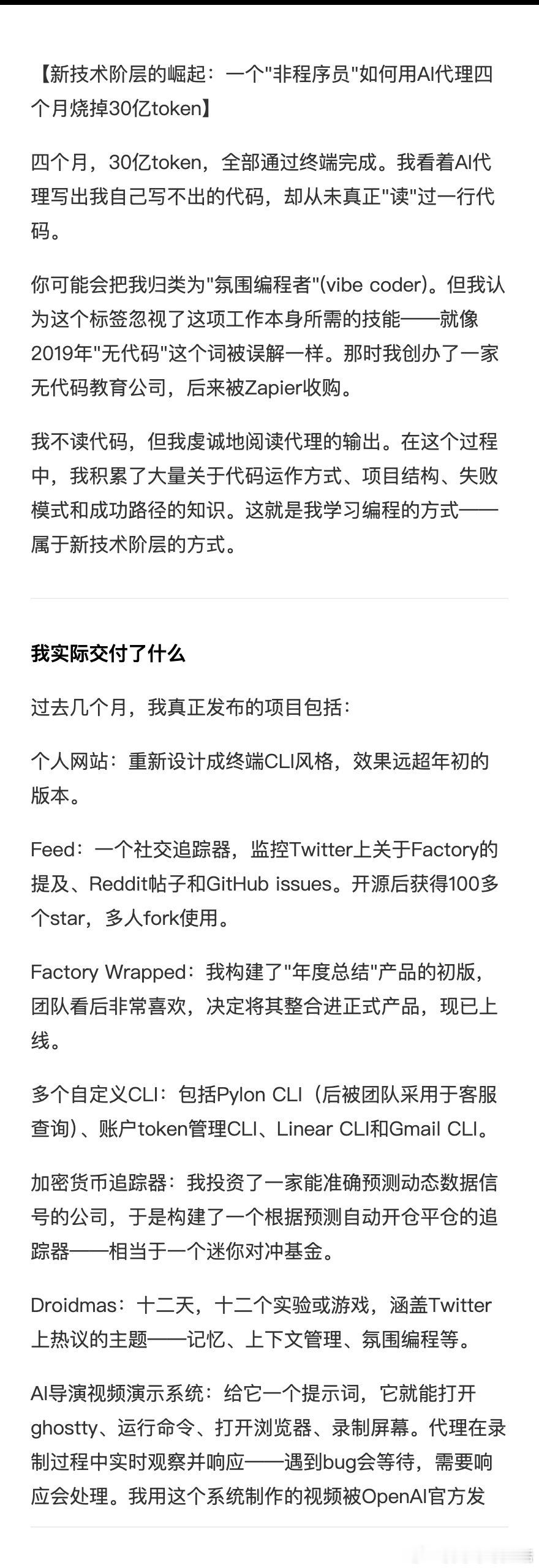 【新技术阶层的崛起:一个"非程序员"如何用AI代理四个月烧掉30亿token】四个月,30亿token,全部通过终端完成。我看着AI代理写出我自己写不出的代码,却从未真正"读"过一行代码。你可能会把我归类为"氛围编程者"(vibe coder)。但我认为这个标签忽视了这项工作本身所需的技能——就像2019年"无代码"这个词被误解一样。那时我创办了一家无代码教育公司,后来被Zapier收购。我不读代码,但我虔诚地阅读代理的输出。在这个过程中,我积累了大量关于代码运作方式、项目结构、失败模式和成功路径的知识。这就是我学习编程的方式——属于新技术阶层的方式。……x.com/bentossell/status/2006352820140749073