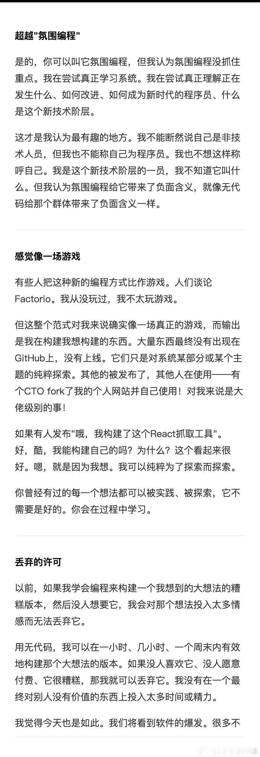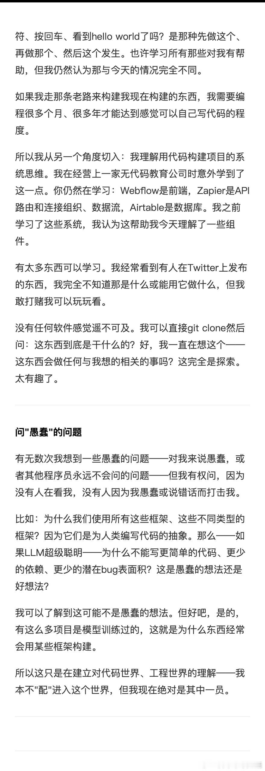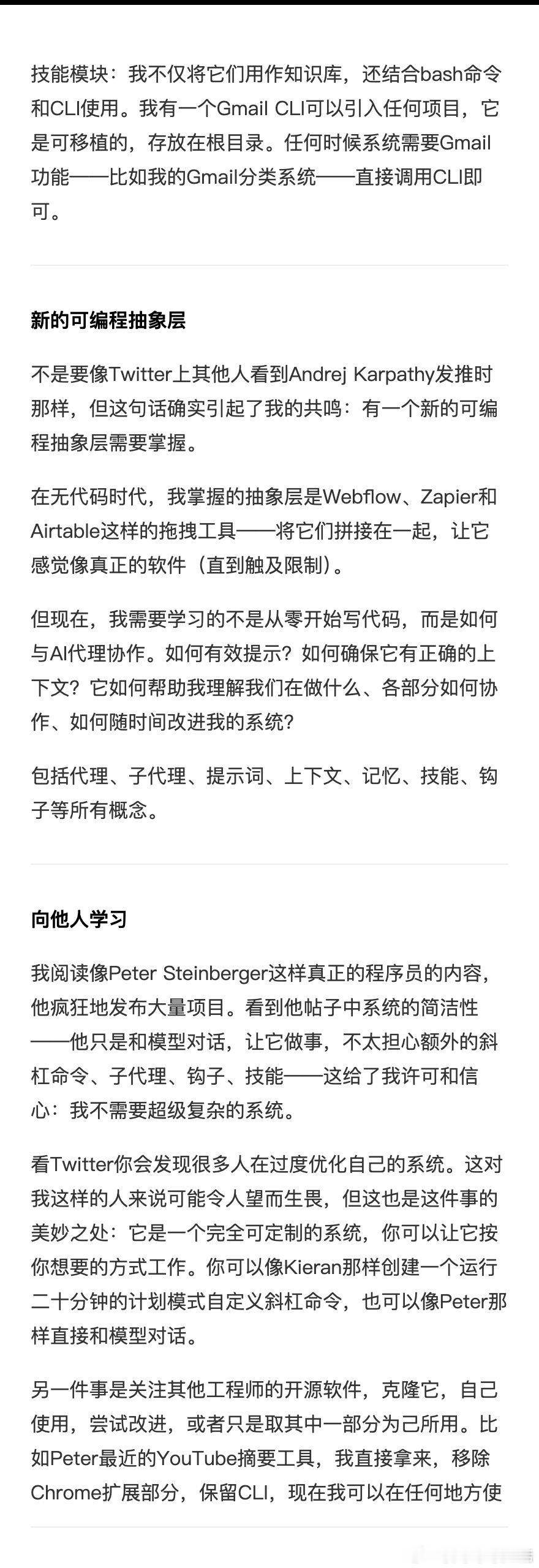 【新技术阶层的崛起:一个"非程序员"如何用AI代理四个月烧掉30亿token】四个月,30亿token,全部通过终端完成。我看着AI代理写出我自己写不出的代码,却从未真正"读"过一行代码。你可能会把我归类为"氛围编程者"(vibe coder)。但我认为这个标签忽视了这项工作本身所需的技能——就像2019年"无代码"这个词被误解一样。那时我创办了一家无代码教育公司,后来被Zapier收购。我不读代码,但我虔诚地阅读代理的输出。在这个过程中,我积累了大量关于代码运作方式、项目结构、失败模式和成功路径的知识。这就是我学习编程的方式——属于新技术阶层的方式。……x.com/bentossell/status/2006352820140749073