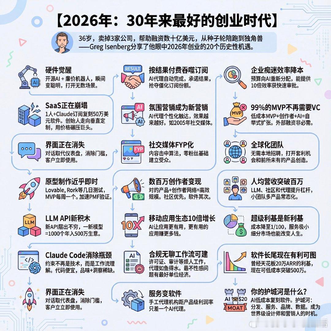【2026年:30年来最好的创业时代】36岁,卖掉3家公司,帮助融资数十亿美元,从种子轮陪跑到独角兽——Greg Isenberg分享了他眼中2026年创业的20个历史性机遇。核心观点值得每个创业者深思:1、硬件觉醒。开源AI模型+廉价机器人,瞬间变聪明,无数应用场景被打开。2、SaaS正在崩塌。曾经需要30个工程师、50万美元的软件,现在1个人+Claude订阅就能复刻。创始人将走向更垂直、更定制的方向,用价格碾压巨头。3、按结果付费正在吞噬订阅制。AI代理自动完成工作,创始人可以承诺结果而非功能,这是从僵化订阅模式中抢夺市场份额的巨大套利机会。4、氛围营销成为新营销。用AI代理做个性化触达、广告和内容创作,效果越来越好。这就像2005年入场社交媒体。5、社交媒体FYP化。分发不再需要庞大粉丝基础,只需内容击中算法。创始人可以零广告从零建立受众,再转化为私域。6、界面正在消失。对话正在取代仪表盘,消除培训门槛,客户可以立即使用复杂产品。7、企业痴迷于效率和降本。预算正在向AI重新分配,传统软件支出被削减,为AI替代方案腾出空间。能提供10倍效率的创业公司将获得快速审批通道。8、99%的MVP不再需要VC。低成本MVP+创作者合作+AI自动化,让自举式扩张成为可能。对大多数软件业务来说,外部融资已非必需。9、全球化团队。不再需要在本地招聘,打开了大量套利机会和前所未有的产品创造方式。10、数百万创作者渴望变现。如果你有对的产品、对的创作者网络,可以极其高效地达到规模。下一代创始人正在社区优先、软件其次地构建创业公司。11、原型制作近乎即时。用Lovable、Rork等工具,几天就能测试想法。MVP速度基本是每周一个。这为小公司多产品运营创造了空间,也加速了PMF验证。12、LLM API每周都在创造新积木。新API和工具层出不穷,每一个新模型发布,可能就有1000个想法能在其上构建成年收入500万美元的生意。13、人均营收突破百万美元。借助LLM、社区和代理的杠杆,员工效率大幅提升。小团队拥有多个产品和业务将成为常态,控股公司将和创业公司一样普遍。14、超级利基是新利基。因为创建软件创业公司的成本降到1/100,你可以服务极小的细分市场,依然能建立改变人生的生意。15、移动应用生态即将10倍增长。AI让应用更有用,更有用的应用赚更多钱。16、合规和无聊工作流突然可建。许可证、审计、保险、工资边缘案例、申报、招标——这些以前对创业公司来说太烦人了。代理在规则、清单和重复上如鱼得水。最不性感的问题现在有了最好的单位经济。17、Claude Code杀死了工程瓶颈。约束不再是"我们能不能建",而是"我们是否足够深入理解工作流"。获胜的创始人是那些将部落知识编码进代理的前运营者。代码便宜,品味+领域洞察稀缺。18、软件长尾现在有利可图。曾经天花板20万美元ARR的利基,现在可以以近乎零边际成本突破500万美元。19、服务正在悄悄变成软件。手工代理机构距离产品级利润率只差一个AI代理。20、如果AI能用每月20美元复刻50万美元的软件,你的护城河是什么?分发、客户服务、品牌、数据……现在是成为世界级设计师和营销人的绝佳时机。这是最罕见的窗口期——多重技术变革同时碰撞,创造了一个短暂的时期,小团队可以构建以前不可能的东西。这个独特时刻不会永远持续。市场会适应,巨头会反应,窗口会关闭。但现在,一个有清晰愿景和行动偏好的创始人,六个月能建成的东西,以前需要数年。下一代伟大公司正在被创造,很多创始人你从未听说过。有些人在以前的周期里根本没有机会。这就是这些罕见窗口的美妙之处:竞技场短暂地变得平等,未来属于那些看得清楚、先行动的人。不要收藏,不要转发,去建造点什么吧。x.com/gregisenberg/status/2006382073418752250
