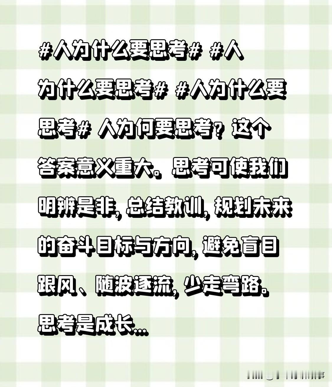 人为何要思考?这个答案意义重大。 思考可使我们明辨是非,总结教训,规划未来的奋斗目标与方向,避免盲目跟风、随波逐流,少走弯路。 思考是成长的利器,回顾过往、立足当下、规划未来,于得失中积累经验,日子有盼头,人更有底气。 思考也是担当责任的底气,个人凭它立足,众人靠它成事,从过好生活到守护家国,它让我们找到办法、凝聚力量。 当下信息获取容易,深度思考能串起碎片形成认知,助我们在众多观点中理性判断,此乃思考的价值。