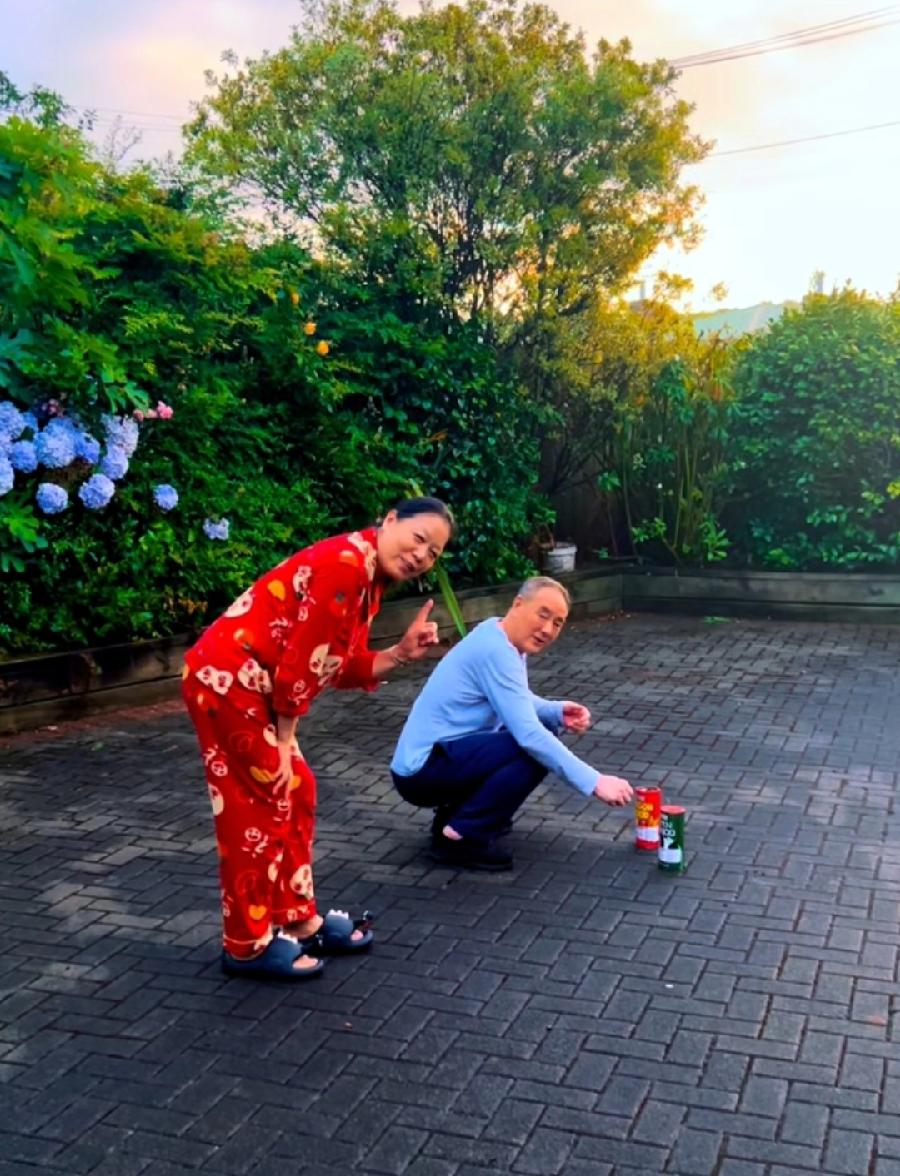 丁团长王全有,与老婆陈玲,在新西兰庆祝跨年,老两口子童心不减,在大院子里放了两筒