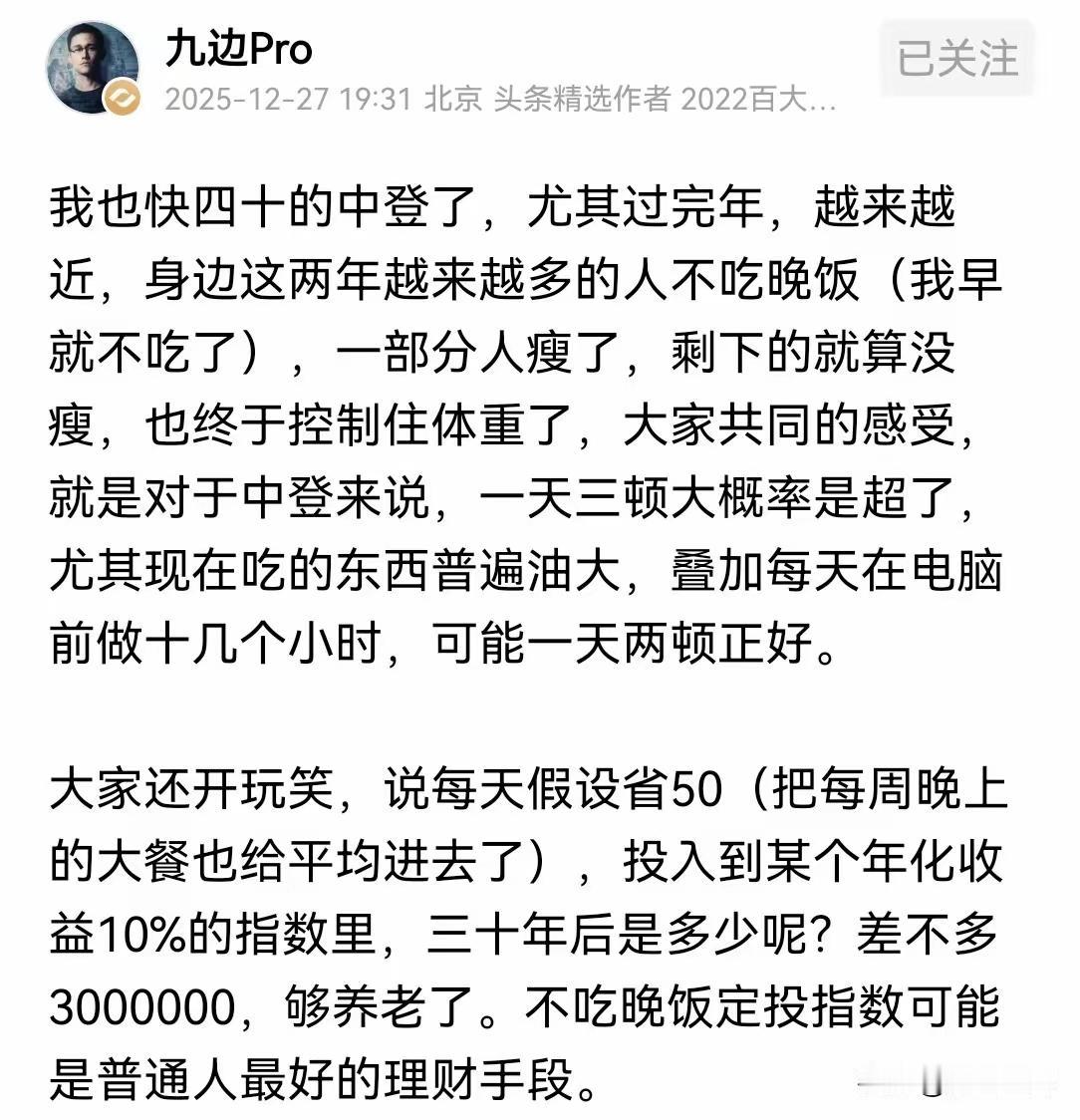 不吃晚饭省下来钱搞投资,九边别开玩笑了 九边说对普通人来讲,不吃晚饭可以每天省下来几十块钱,可以集中起来搞投资,如果年收益比较好的话,是一笔不菲的收入。 我只想说,九边你别开玩笑了。 第一,大多数人晚餐不会超过50块钱 之前都说闫学晶脱离群众,九边在这里也有点脱离群众了 一顿晚餐50块钱,大多数家庭都是达不到这个标准的,更不用说每个人的标准了。 即便是对于那些中产阶级,除了偶尔的出去吃饭,大多数情况下在家里简单炒个菜喝点粥就拉倒了。 对普通家庭来讲,每天晚上固定的支出50块钱一个月1500块钱,这标准太高了。 第二,哪儿有年华收益率10%的投资啊? 现在银行存款利息那么低,就算是网上有不少年化收益率10%的投资,你敢投吗? 对于普罗大众来讲,投资这件事情上坑太多,一般人是不敢碰的。 而且还要看30年以后的收益,30年以后,谁知道会怎么样? 10年前我还玩余额宝呢,当时的价格多高啊,现在余额宝的利率多低呀? 第三,对普罗大众来讲,好好的吃一顿晚饭,是一家人的幸福来源。 大多数人是早晨是没办法一块吃的,时间也紧张,上班的上班上学的上学有的时候早餐直接都免了。 中午学生在学校吃上班呢,在公司吃。 只有晚上一家人能够团聚,也只有晚上一家人能够安安静静的坐在饭桌前吃一顿团圆饭。 我现在要把这笔钱给省了,然后说要搞投资。 这一家人还像一家人吗? 当然九边在这里只是提供了一个思路,但对于普通人来讲,这个建议没有必要采纳。 很多人都会看看他的这个建议,直接就会说一句,九边,别再开玩笑了。