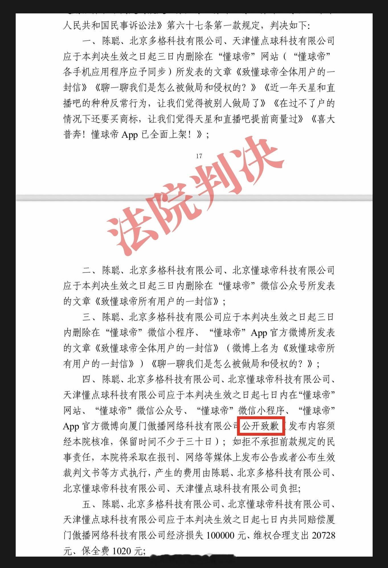 懂球帝侵犯直播吧名誉权被判赔偿12月30日,创始人发文:之前我们起诉北京多格公司(懂球帝)及其法人陈聪侵犯我司名誉权的判决已经出来了,法院判决对方赔偿,并且需要在自己的平台上道歉。据此前媒体报道,2024年10月,“懂球帝”创始人发布《致懂球帝全体用户的一封信》,称团队遭遇“创业以来最没有底线的恶性商业竞争和做局阴谋”,表示直播吧以2090万的价格拍走“懂球帝”和“all football”部分商标。直播吧创始人回应称,40个“懂球帝”商标是因持有人欠钱不还,被法院强制执行拍卖,不存在联合做局。同时表示,对于诽谤和造谣,会采取法律手段。体育大赏我的年度赛场记忆体坛风云