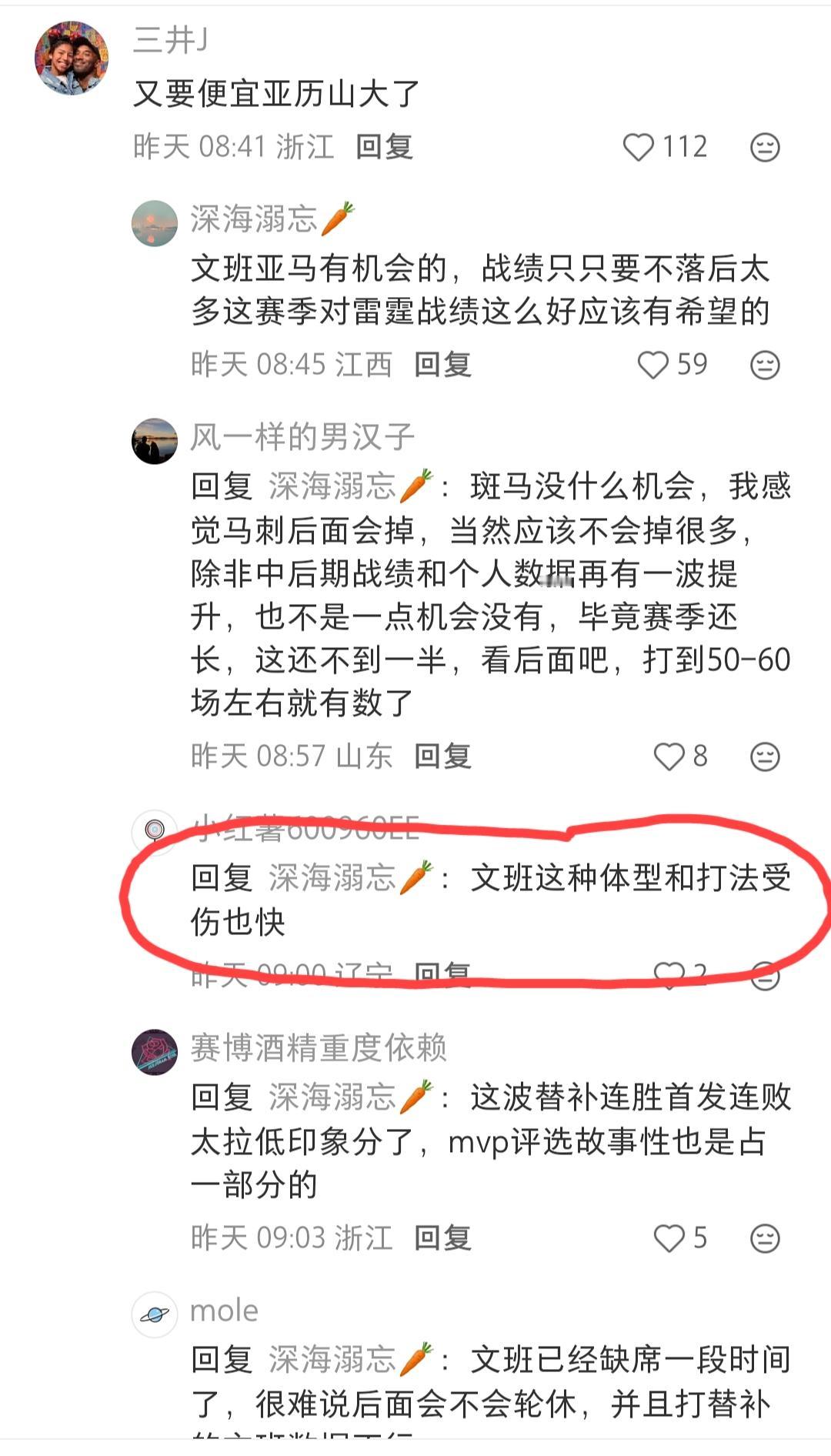 约基奇受伤,文班亚马也受伤,亚历山大本赛季常规赛mvp十拿九稳了!!! 前几天在约基奇受伤的帖子下面,大家在讨论“约基奇伤退便宜了谁”,有网友就提到了文班亚马,另外一位网友直接来了这么一句:“文班这种体型和打法受伤也快”,这下真的被他一语成谶了,真的是“好的不灵坏的灵”,如此看来,文班亚马一次的“少林苦休”还不够,2026年夏天还要来少林!!! 大牌球星接连受伤,nba本赛季是不是被下诅咒啦。这个情况的发生对nba接下去的收视率肯定不是好事!