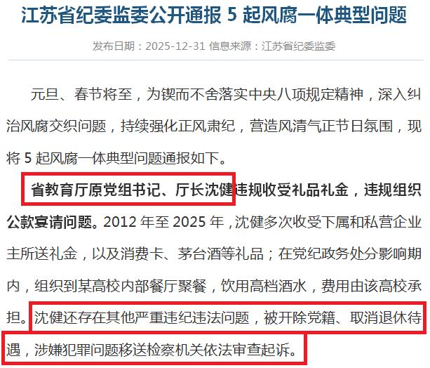 喜讯!沈健被查,值得所有江苏人高兴的消息! 沈健是个比较大众的名字,这里说的是江苏省教育厅原厅长沈健。他在2008年3月至2017年3月任江苏省教育厅长,现已被开除党籍,清除出队伍,不能再称为同志了。 沈健此人在担任江苏省教育厅长期间,瞎折腾江苏中学教育,瞎搞教育改革,推行一些极不合理的改革措施,导致江苏从一个教育大省变为教育小省,教育强省变为教育弱省。 外省的人可能不大了解,从2008年开始,江苏高考只考语文、数学和外语3门,总分只有480分,物理和化学只作简单水平测试,不计入高考总分,可以说轻视理科到了极点。 如此奇葩的高考制度,从2008年起执行,至2020年才结束——对应2017级高中生,而沈健是2008年3月任教育厅长,2017年3月卸任,时间上刚好覆盖。 如此奇葩的高考制度,导致很多江苏学生上了大学需要重新学习物理,大学成绩受到很大影响,一些好大学变得不喜欢江苏学生,不断缩减在江苏的招生名额。 实际上,被影响的不仅仅是高考,连各种奥赛等竞赛也不例外,有心人可以发现,江苏学生的名字一度从各种竞赛名单中消失不见了,此种情况实在让人唏嘘。 苍天有眼,2025年12月31日,一年的最后一天,国家给江苏人民送上了喜讯——这个把江苏教育折腾得不轻,祸害江苏孩子十多年的沈健,被查了!