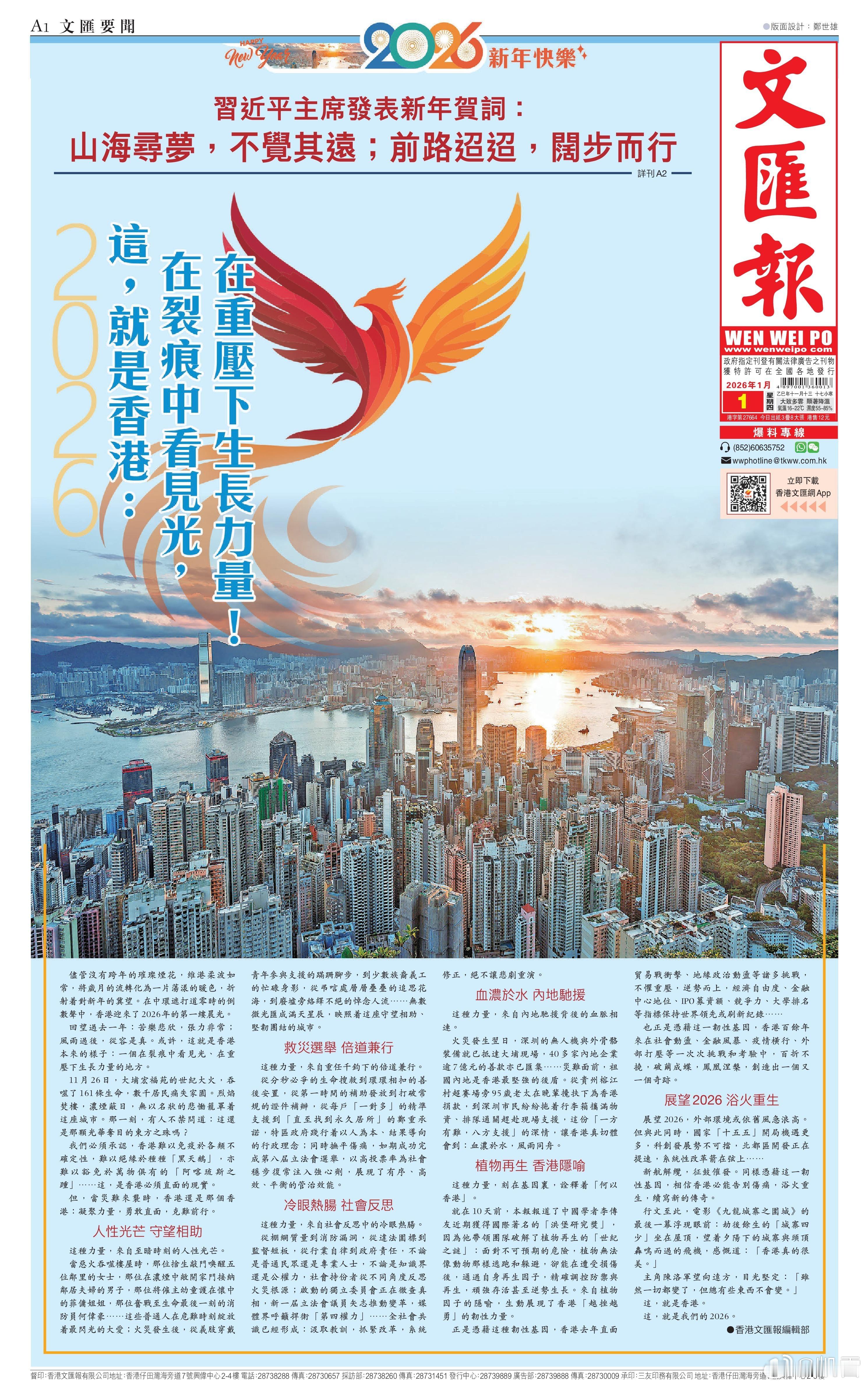 香港文汇报编辑部 新年献词 展望2026 何以香港,应对危机与挑战这16个字:倍道兼行,浴火重生,新航解缆,征鼓催发這,就是香港:在裂痕中看見光,在重壓下生長力量! 展望2026,外部环境或依旧风急浪高。但与此同时,国家「十五五」开局机遇更多,科创发展势不可挡,北都区开发正在提速,系统性改革箭在弦上…… 新航解缆,征鼓催发。同样凭借这一韧性基因,相信香港必能告别伤痛,浴火重生,续写新的传奇。 行文至此,电影《九龙城寨之围城》的最后一幕浮现眼前:劫后余生的「城寨四少」坐在屋顶,望着夕阳下的城寨与头顶轰鸣而过的飞机,感慨道:「香港真的很美。」 主角陈洛军望向远方,目光坚定:“虽然一切都变了,但总有些东西不会变。” 这,就是香港。 这,就是我们的2026。尽管没有跨年的璀璨烟花,维港柔波如常,将岁月的流转化为一片荡漾的暖色,折射着对新年的冀望。在中环遮打道零时的倒数声中,香港迎来了2026年的第一缕晨光。回望过去一年:苦乐悲欣,张力非常;风雨过后,从容是真。或许,这就是香港本来的样子:一个在裂痕中看见光、在重压下生长力量的地方。11月26日,大埔宏福苑的世纪大火,吞噬了161条生命,数千居民痛失家园。烈焰焚楼,浓烟蔽日,无以名状的悲恸笼罩着这座城市。那一刻,有人不禁问道:这还是那颗光华夺目的东方之珠吗?我们必须承认,香港难以免疫于各类不确定性,难以绝缘于种种「黑天鹅」,亦难以豁免于万物俱有的「阿喀琉斯之踵」……这,是香港必须直面的现实。但,当灾难来袭时,香港还是那个香港:凝聚力量,勇敢直面,克难前行。人性光芒 守望相助这种力量,来自至暗时刻的人性光芒。当恶火吞噬楼屋时,那位舍生敲门唤醒五位邻里的女士,那位在浓烟中敞开家门接纳邻居夫妇的男子,那位将雇主幼童护在怀中的菲佣姐姐,那位奋战至生命最后一刻的消防员何伟豪……这些普通人在危难时刻绽放着最闪光的大爱;火灾发生后,从义肢穿戴青年参与支持的蹒跚脚步,到少数族裔义工的忙碌身影,从吊唁处层层迭迭的追思花海,到废墟旁络绎不绝的悼念人流……无数微光汇成满天星辰,映照着这座守望相助、坚韧团结的城市。救灾选举 倍道兼行这种力量,来自重任千钧下的倍道兼行。从分秒必争的生命搜救到环环相扣的善后安置,从第一时间的补助发放到打破常规的证件补办,从每户「一对多」的精准支持到「直至找到永久居所」的郑重承诺,特区政府践行着以人为本、结果导向的行政理念;同时抚平伤痛,如期成功完成第八届立法会选举,以高投票率为社会稳步复常注入强心剂,展现了有序、高效、平衡的管治效能。冷眼热肠 社会反思这种力量,来自社会反思中的冷眼热肠。从棚网质量到消防漏洞,从违法围标到监督短板,从行业自律到政府责任,不论是普通民众还是专业人士,不论是知识界还是公权力,社会持份者从不同角度反思火灾根源;激活的独立委员会正在彻查真相,新一届立法会议员矢志推动变革,媒体界呼吁捍卫「第四权力」……全社会共识已经形成:汲取教训,抓紧改革,系统修正,绝不让悲剧重演。血浓于水 内地驰援这种力量,来自内地驰援背后的血脉相连。火灾发生翌日,深圳的无人机与外骨骼装备就已抵达大埔现场,40多家内地企业逾7亿元的善款亦已汇集……灾难面前,祖国内地是香港最坚强的后盾。从贵州榕江村超赛场旁95岁老太在晚辈搀扶下为香港捐款,到深圳市民纷纷拖着行李箱携满物资、排队通关赶赴现场支持,这份「一方有难,八方支援」的深情,让香港真切体会到:血浓于水,风雨同舟。植物再生 香港隐喻这种力量,刻在基因里,诠释着「何以香港」。就在10天前,本报报道了中国学者李传友近期获得国际著名的「洪堡研究奖」,因为他带领团队破解了植物再生的「世纪之谜」:面对不可预期的危险,植物无法像动物那样逃跑和躲避,却能在遭受损伤后,通过自身再生因子,精确调控防御与再生,顽强存活甚至逆势生长。来自植物因子的隐喻,生动展现了香港「越挫越勇」的韧性力量。正是凭借这种韧性基因,香港去年直面贸易战冲击、地缘政治动荡等诸多挑战,不惧重压,逆势而上,经济自由度、金融中心地位、IPO募资额、竞争力、大学排名等指标保持世界领先或刷新纪录……也正是凭借这一韧性基因,香港百余年来在社会动荡、金融风暴、疫情横行、外部打压等一次次挑战和考验中,百折不挠,破茧成蝶,凤凰涅盘,创造出一个又一个奇迹。展望2026 浴火重生展望2026,外部环境或依旧风急浪高。但与此同时,国家「十五五」开局机遇更多,科创发展势不可挡,北都区开发正在提速,系统性改革箭在弦上……新航解缆,征鼓催发。同样凭借这一韧性基因,相信香港必能告别伤痛,浴火重生,续写新的传奇。行文至此,电影《九龙城寨之围城》的最后一幕浮现眼前:劫后余生的「城寨四少」坐在屋顶,望着夕阳下的城寨与头顶轰鸣而过的飞机,感慨道:「香港真的很美。」主角陈洛军望向远方,目光坚定:「虽然一切都变了,但总有些东西不会变。」这,就是香港。这,就是我们的2026。新年献辞新年献词新年贺词2026新年贺词