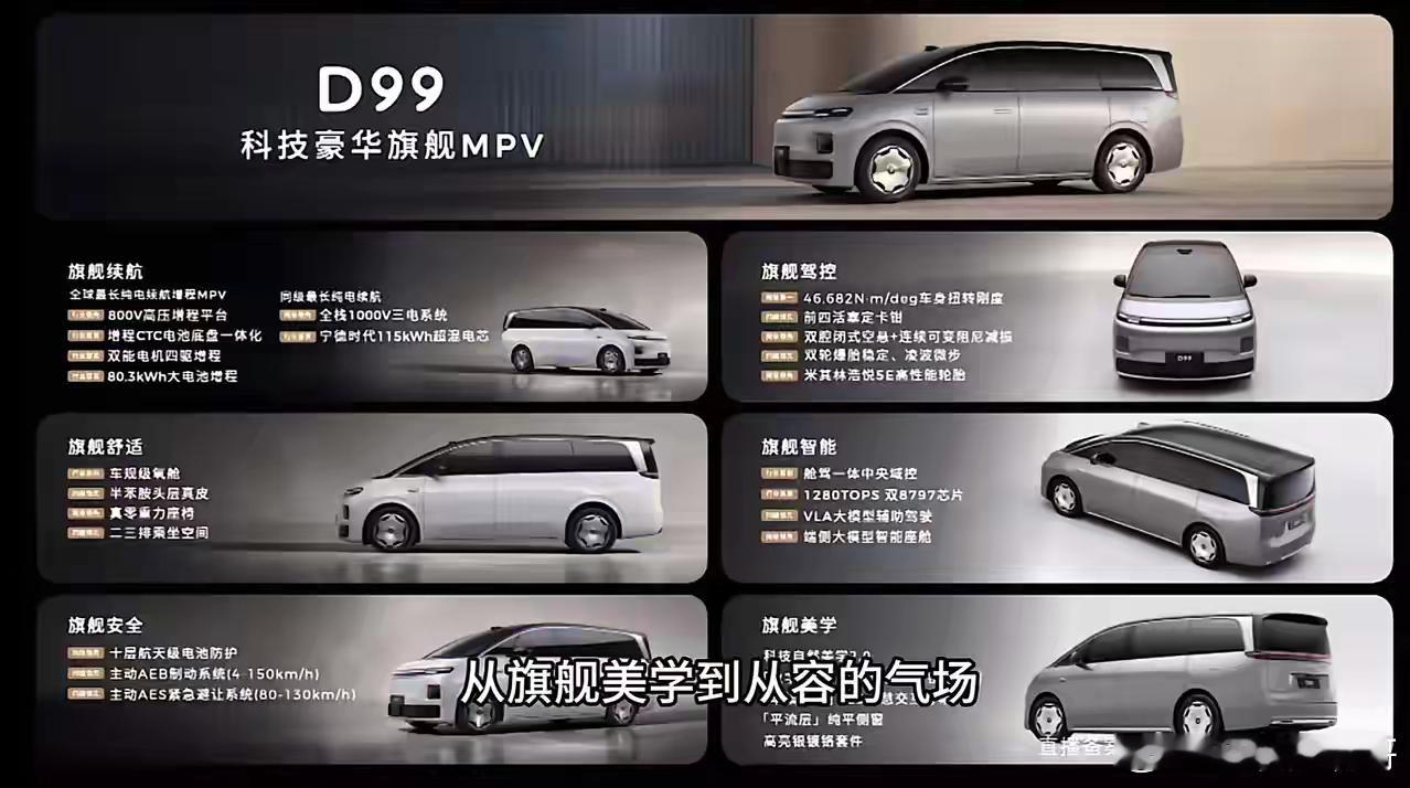 明年的MPV市场要变天了,零跑D99的发布,全栈1000V高压系统,115度宁德时代电池,80度混动大电池,5米2的车长,2米的车宽,1280TOPS的算力等等核心的配置都给你配上了,相信给一些车企会带来不小的压力,如果这车纯电和混动价格能到25万左右,估计就没有其他MPV什么事儿,高山8,腾势D9,小鹏X9,岚图梦想家估计都要推沟里了。以后就形成了高端智驾MPV有点智界V9,中低端家用MPV有D99的新局面。