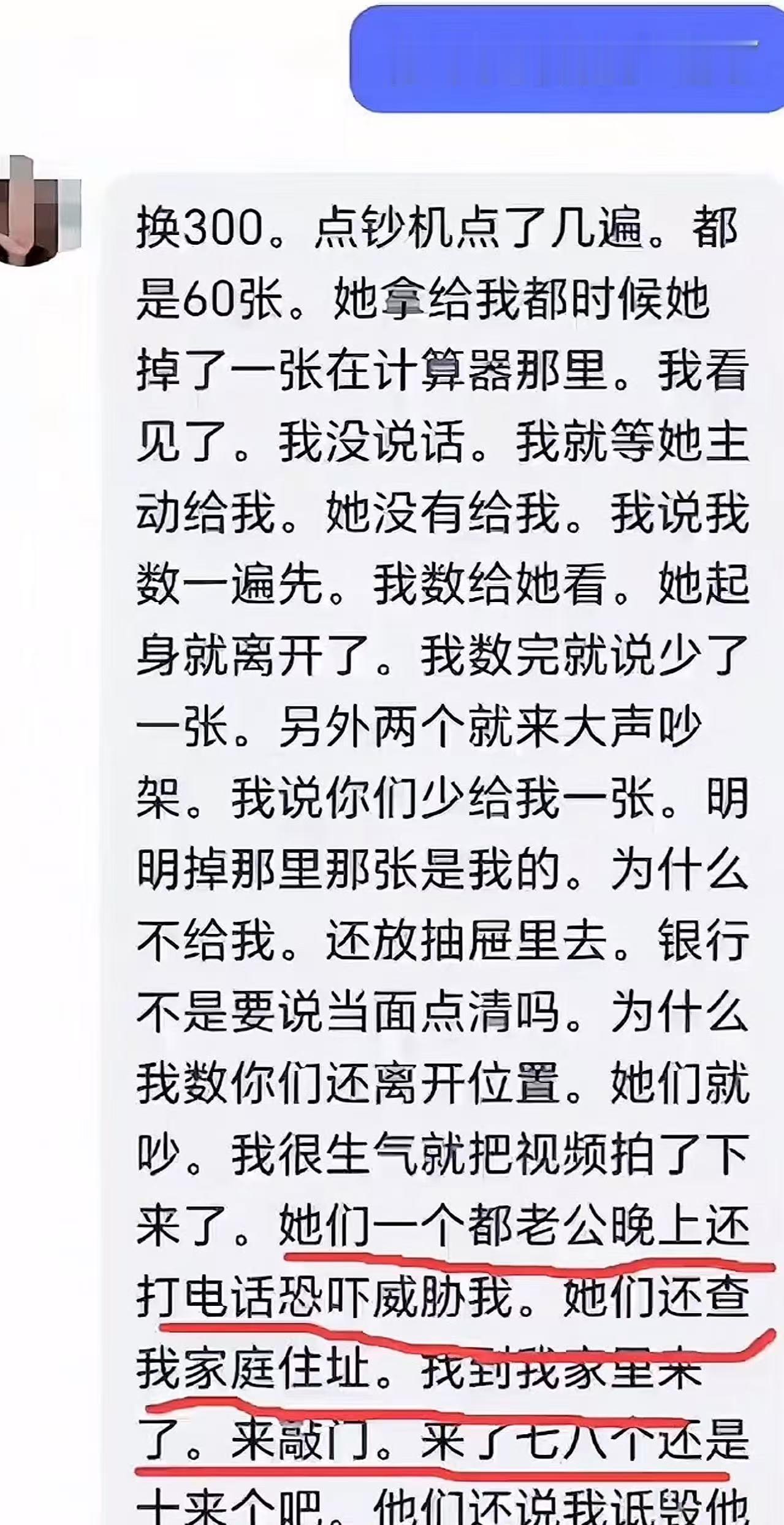 12月25日,湖南娄底,女子去银行取钱,柜员给她钱时掉了一张出来,女子以为柜员会捡起来给自己,可是柜员却把钱放到抽屉里。女子要求柜员归还,柜员说钱没错,起身离开了岗位。女子把这事发到网上,没想到,当天有人打电话威胁她,还带了六七个人去敲她家的门。(来源:法治视讯) 事发当天,一位女子踏入了银行的大门,准备取走自己急需的300元钱。这本应是一次再平常不过的银行交易,却没想到,一系列意想不到的事件就此展开,将她的生活搅得波澜起伏。 女子排着队,心中或许在盘算着这300元钱的用途,终于轮到她了。她来到柜台前,向柜员说明了自己的需求。柜员熟练地操作着,很快,一沓钱递到了女子面前。女子接过钱,正准备清点,就在这时,意外发生了。 一张5元纸币从柜员递来的钱中滑落,掉在了柜台上。女子下意识地认为,柜员应该会捡起这张钱交给自己,毕竟这是自己应得的款项。然而,事情的发展却出乎她的意料,柜员似乎并没有看到掉落的纸币,或者选择了无视,径直将那张5元纸币放进了抽屉里。 女子的心中涌起一丝疑惑和不满,她礼貌地向柜员提出,要求归还那张掉落的5元纸币。可柜员却坚称钱数没错,说完便起身离开了岗位,留下女子一人在柜台前,满心的委屈和不解。 女子觉得自己的权益受到了侵害,自己明明应该拿到的钱,却就这样被柜员“私藏”了。于是,她决定将这件事情的经过拍摄成视频,发布到了网上,希望能得到一个公正的说法。 视频发布后,女子原本以为会得到网友们的支持与同情,可事情却朝着她意想不到的方向发展。当天,她的手机突然响起,电话那头传来的是威胁的声音。 对方语气凶狠,警告她赶紧把视频删掉,否则有她好看。女子被这突如其来的威胁吓得不知所措,还没等她缓过神来,更可怕的事情发生了。 傍晚时分,一阵急促的敲门声打破了家中的宁静。女子打开门,只见门外站着六七个人,气势汹汹。这些人声称要为柜员讨个说法,指责女子诋毁他人名誉。 女子惊恐万分,她怎么也没想到,自己只是想要回那本就属于自己的5元钱,却招来如此大的麻烦。这些人不仅在她家门口大声喧哗,还对她进行言语上的恐吓,女子感到无比的恐惧和无助。 这件事情在网络上迅速发酵,引起了广泛的关注和热议。网友们纷纷表达自己的看法,有的网友对女子的遭遇表示同情,认为银行作为服务行业,柜员的行为确实存在不当之处,不应该如此对待客户。 一位网友说道:“客户取钱,每一分钱都应该准确无误,柜员这样的做法太不负责任了,还对客户的诉求置之不理,实在不应该。” 也有网友对柜员的行为表示理解,觉得可能是当时工作繁忙,柜员一时疏忽,而且在银行的工作流程中,可能也有相关的规定和操作规范,或许存在一些误会。 但更多的网友则对女子遭到威胁这一情况表示愤慨,认为无论事情的对错如何,威胁他人都是违法行为,必须受到严惩。 好在事情最终得到了相对妥善的解决。警方介入后,对双方进行了调解。银行方面和那位柜员的家属都向女子表达了歉意。 银行行长也亲自出面,承认在管理和员工教育方面存在疏忽,承诺会加强内部管理,避免类似的事情再次发生。女子看到对方诚恳的态度,也表示愿意接受道歉,不再追究此事。 这场由5元纸币引发的风波,看似是一场小小的误会和冲突,却反映出了许多值得我们深思的问题。 在服务行业中,如何更好地保障客户的权益,如何提升员工的服务意识和职业素养,以及在面对矛盾和纠纷时,如何通过合理合法的方式去解决,都是我们需要思考和改进的地方。 希望这样的事情以后不再发生,让我们的生活多一些和谐与理解。 对此你怎么看?欢迎大家在评论区留言讨论。