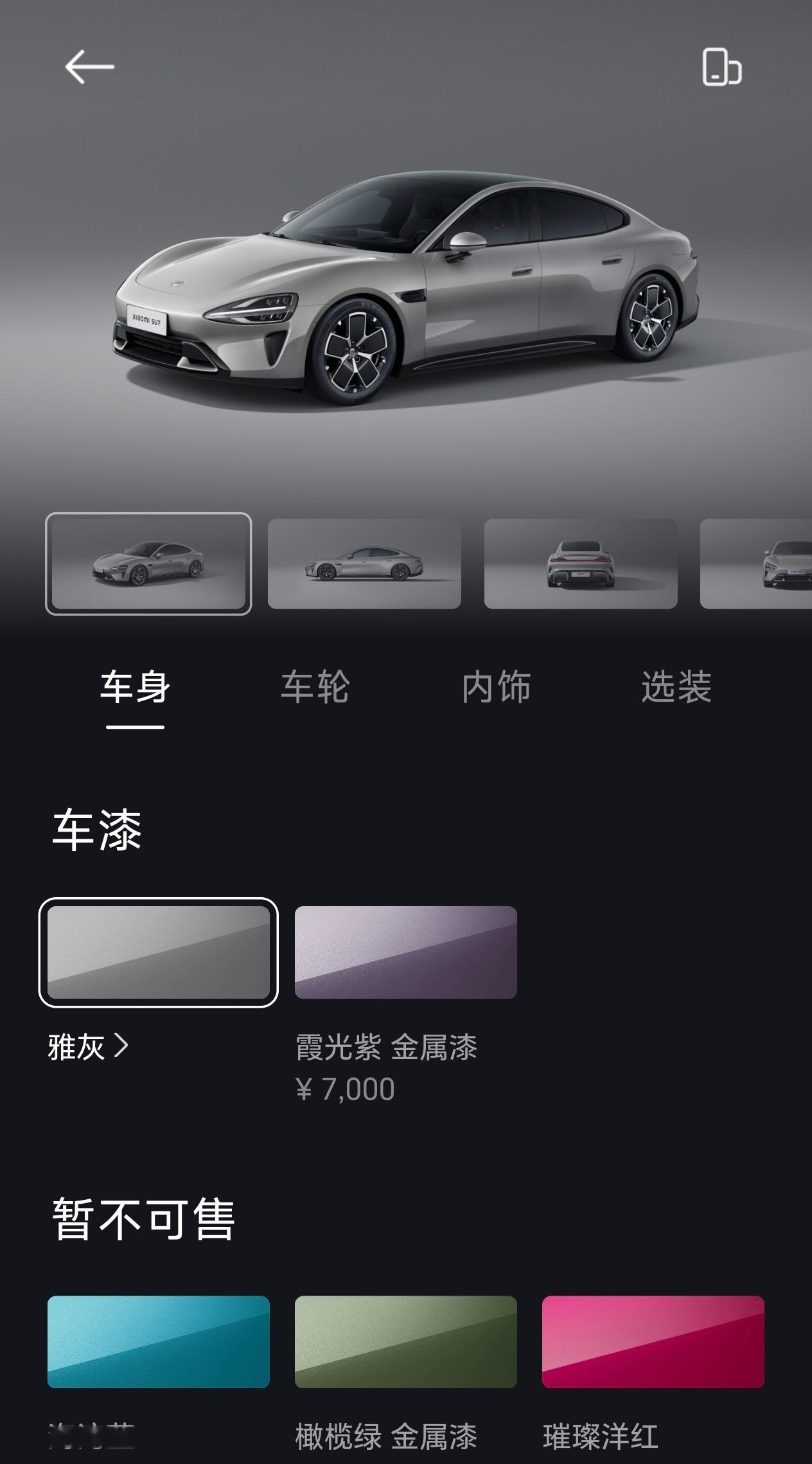 终于,SU7很多配置已经卖光了,现在看APP里显示,SU7外观颜色只剩下2款车漆3种轮毂了两年了,整整两年了,这台同类型从未有过的爆款终于要换代了!哈哈哈哈独孤求败了两年,中间一度因为订单太多而根本不敢改款,SU7这个待遇也是国产头一份了其实新款早就能拿出来了,以小米的研发强度,我估计现在这个改款是推了又推,不断往后改的结果,就是怕背刺老用户但是我从旁观者的角度来看,其实小米没必要这么担心的,与其害怕背刺老用户,早点上市,再拿下一波吓人的订单才是更重要的事