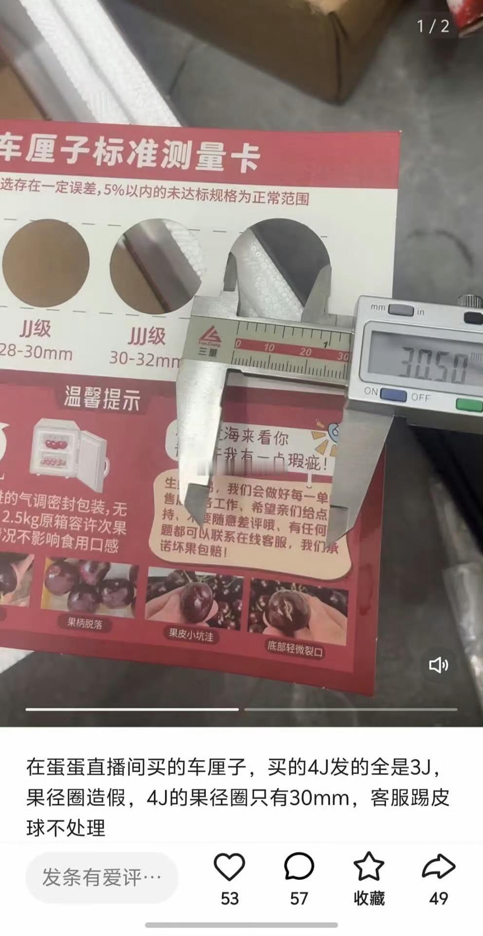 网友质疑蛋蛋卖的车厘子买的4J发的都是3J的,甚至“果径圈”造假,4j的果径圈只有30mm