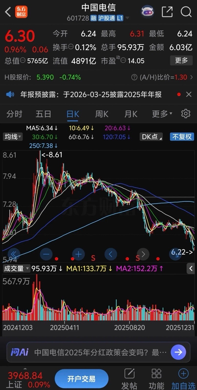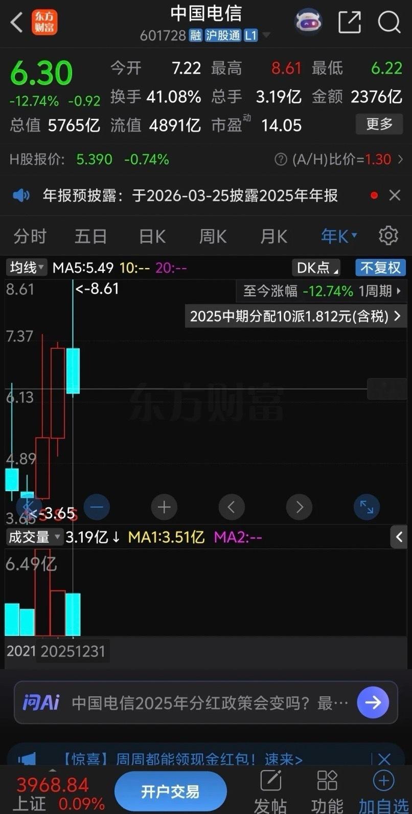 中国电信跌的太惨了,2025年牛市居然暴跌了12.74%,如果从高点算起暴跌高达26%,大盘暴涨,题材股暴涨,亏损股暴涨,天天两万亿的大牛市中国电信居然越跌越低,从6月份开始就一路下跌,一开始股民以为只是正常调整,万万没想到跌着跌着演变成阴跌,股民一波又一波恐慌割肉,尤其是12月市场跌的毫无理性。中国电信估值并不贵,尤其是现在大牛市市盈率仅仅只有14.05,股息率高达4.35,比存款利率高太多了,中国电信作为三大运营商业绩是有保障的,不知道股民担心什么不断的割肉,2026年大概率会企稳反弹,价值投资者千万不要割肉了。今日看盘