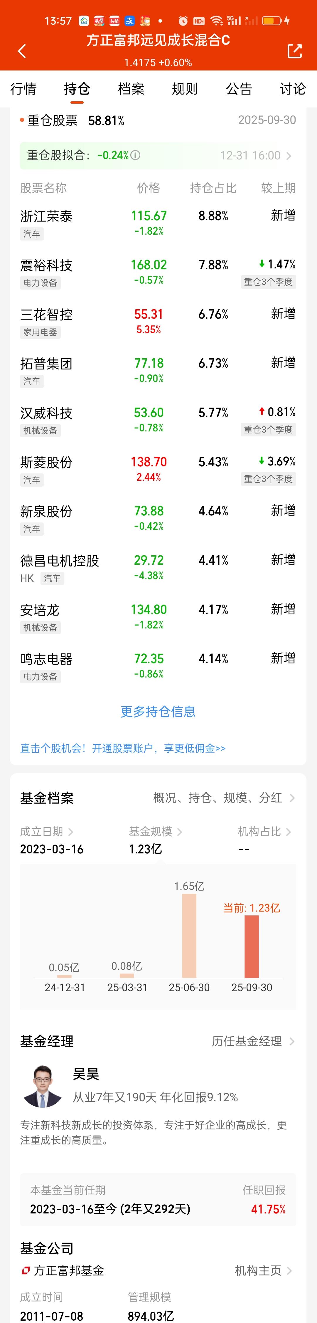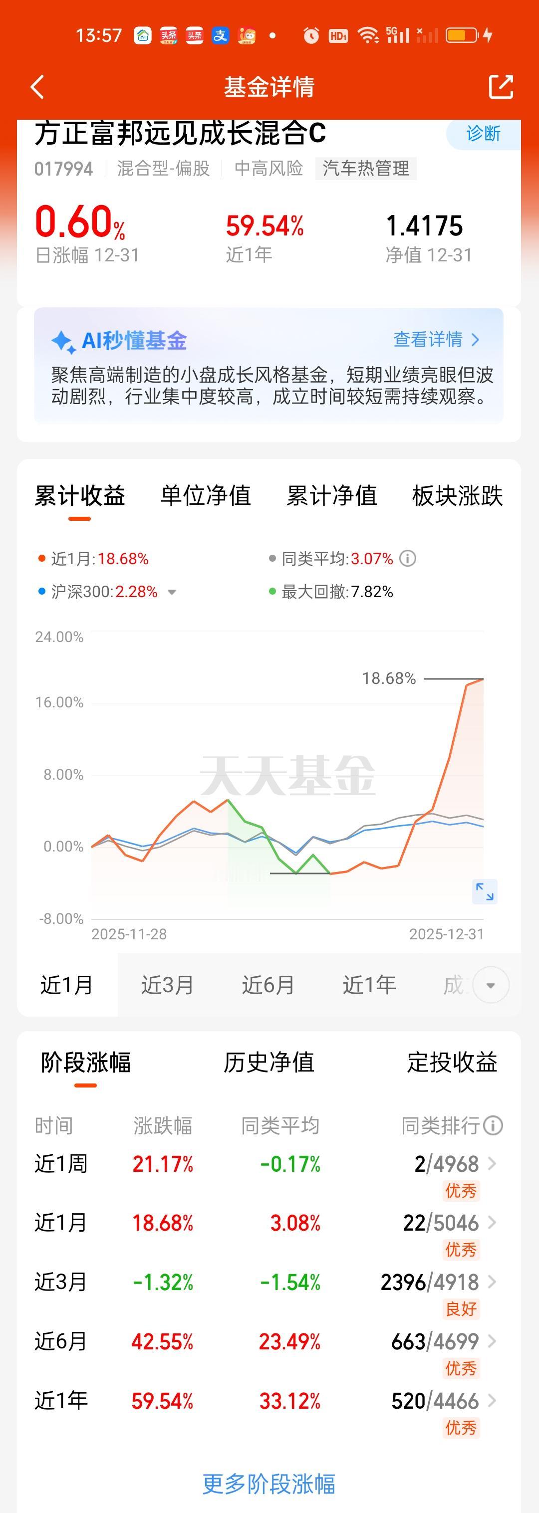周榜历次都变化极大。这周表现最好的其实是机器人板块,商业航天都要退避三舍。其中方正富邦远见成长21.18%拿下第一,前海开源嘉鑫18.96%排名第二,方正富邦信泓18.38%排名第三,永赢高端装备18.37%排名第四,永赢新能源18.13%排名第五。 前五里面就有四只来自机器人板块。后面还有德邦高端装备,财通资管先进制造,永赢先进制造,中航趋势领航,华富科技动能等,可见这周机器人的表现有多么的霸道!机器人板块在2026年依旧值得期待!