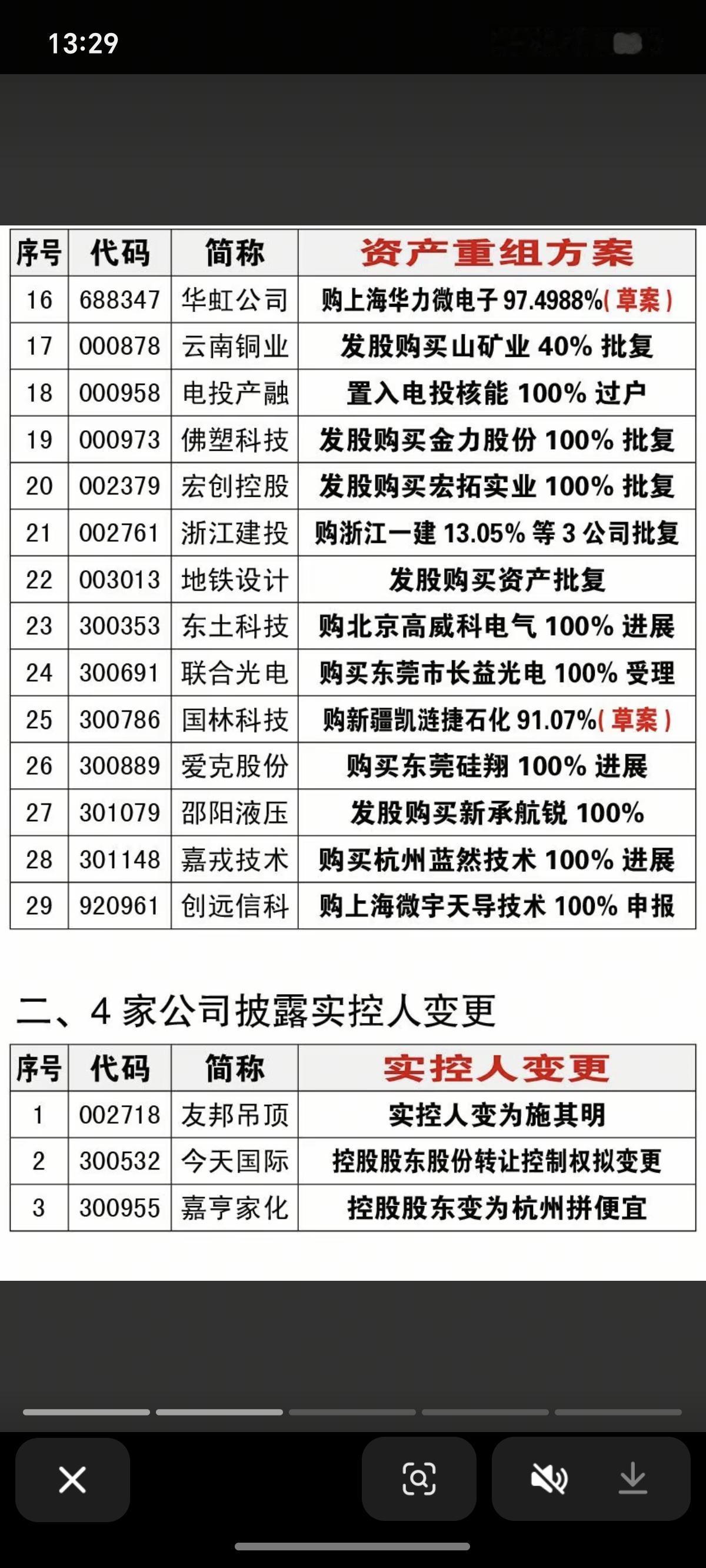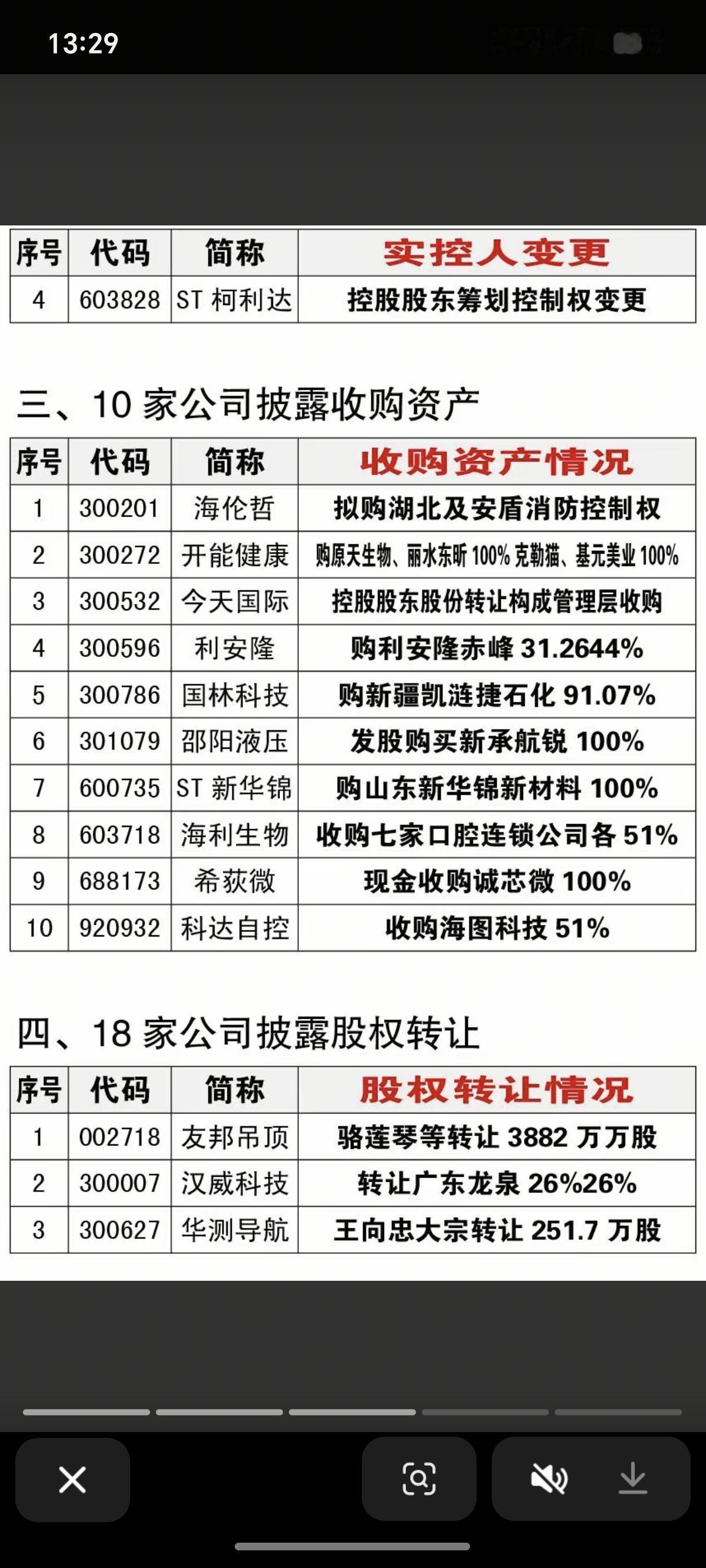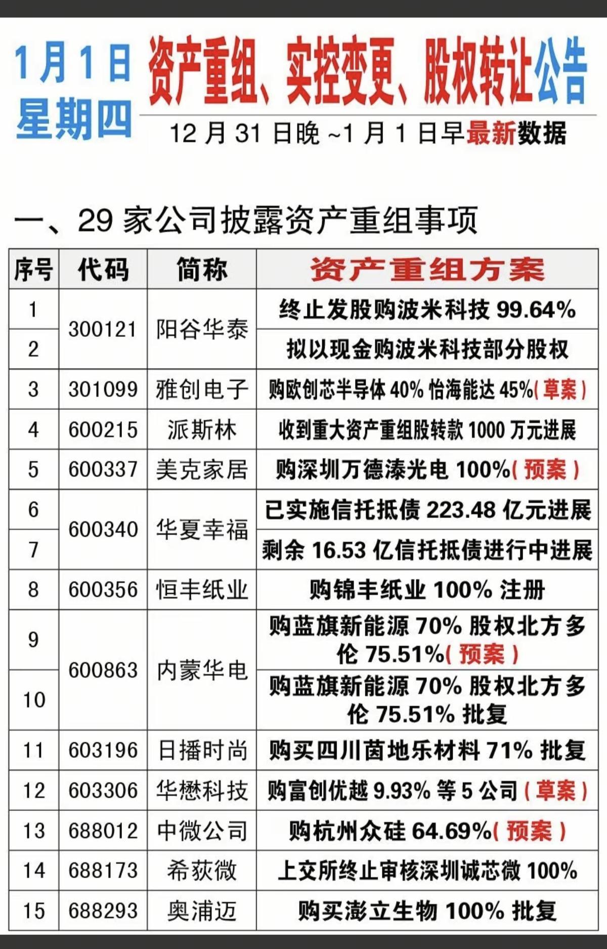 1.1周四 最新:资产重组,实控人变更,股权转让公告汇总! 一、29家公司披露资产重组事项 二、4家公司实控人变更 三、10家公司收购资产 四、18家公司股权转让 五、4家出售资产